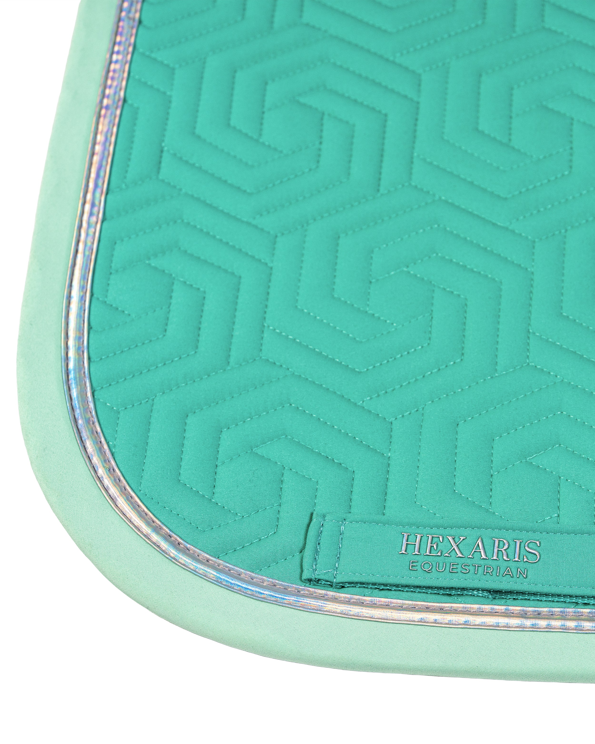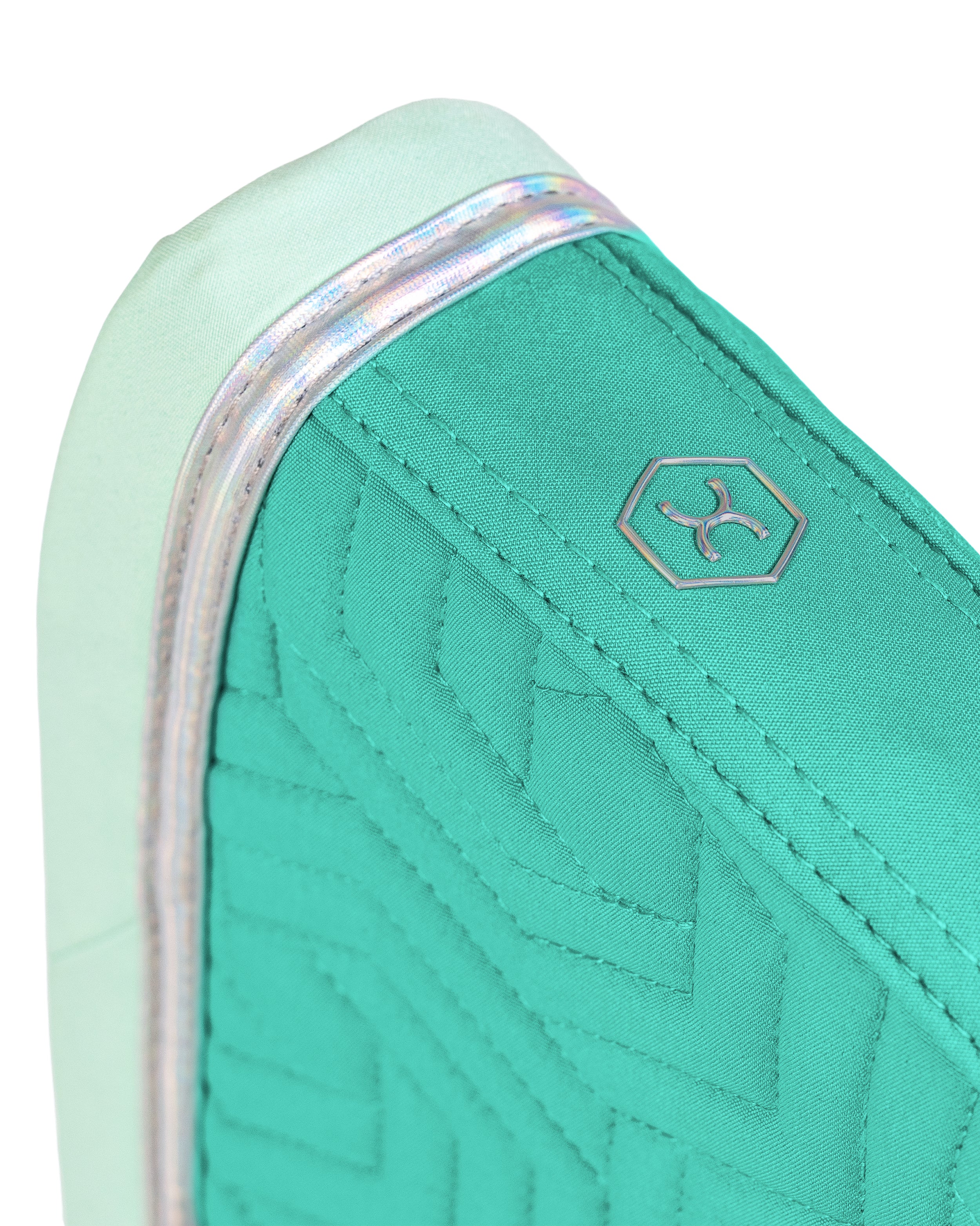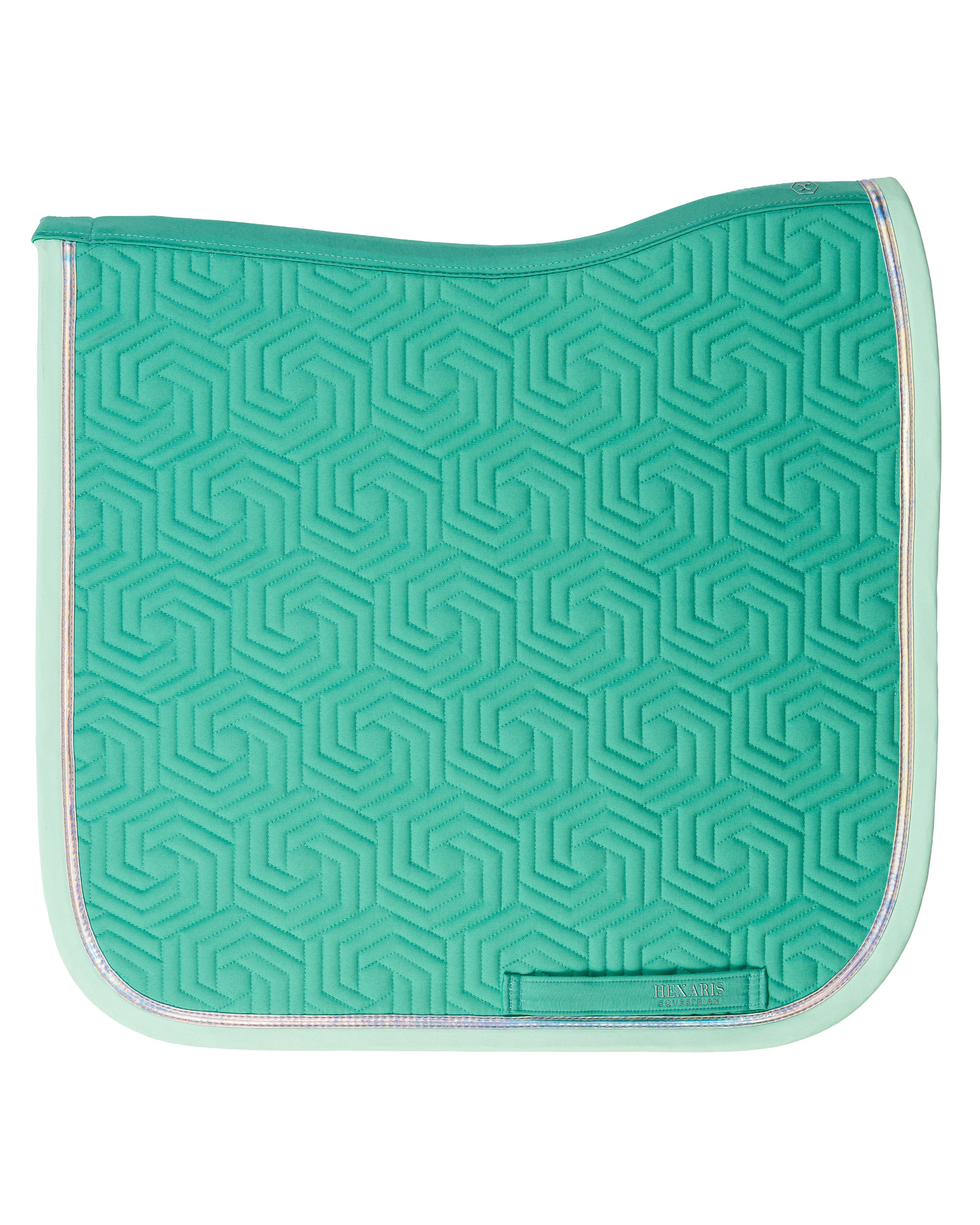 The Paradiso Dressage Saddle Pad in Sea Turquoise combines elegant style with a bold, modern finish. Featuring our signature hexagon quilting, this turquoise dressage saddle pad is complemented by mint-colored binding and finished with stunning matte holographic tape that adds a subtle touch of shine, evoking the vibrant hues of the Caribbean Sea.