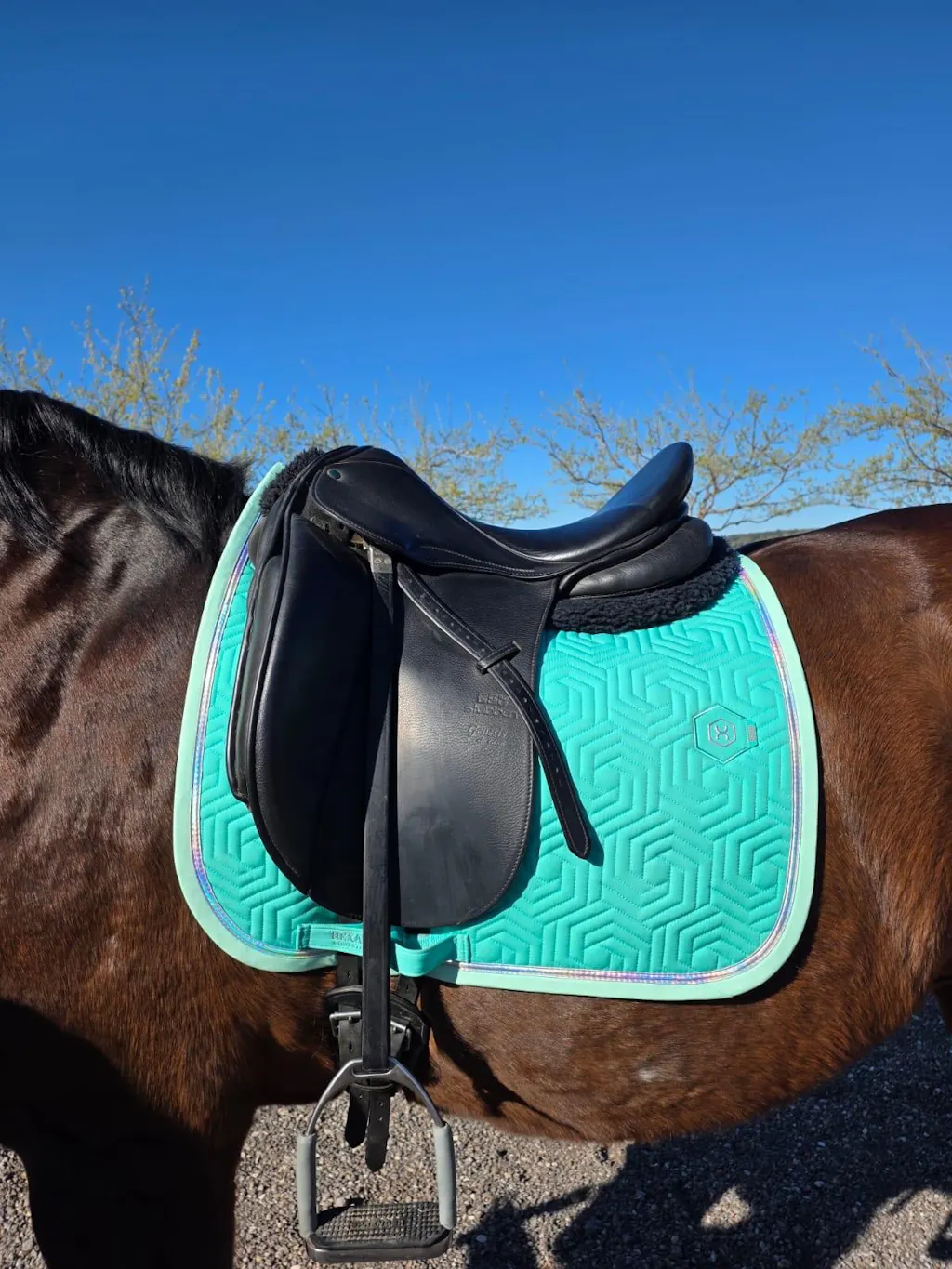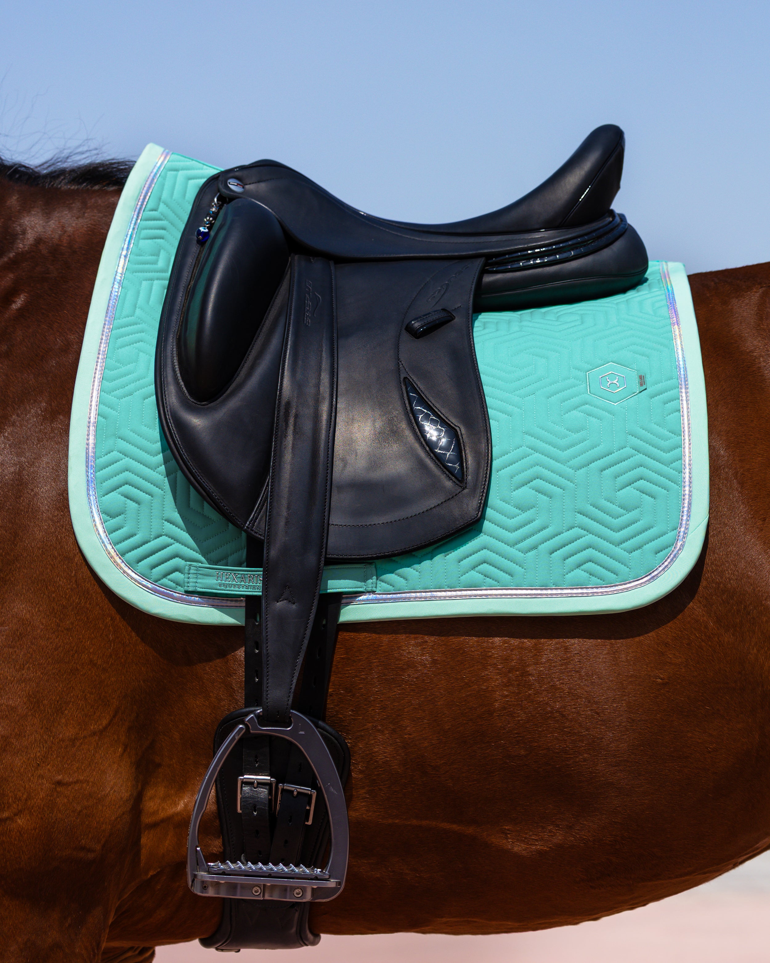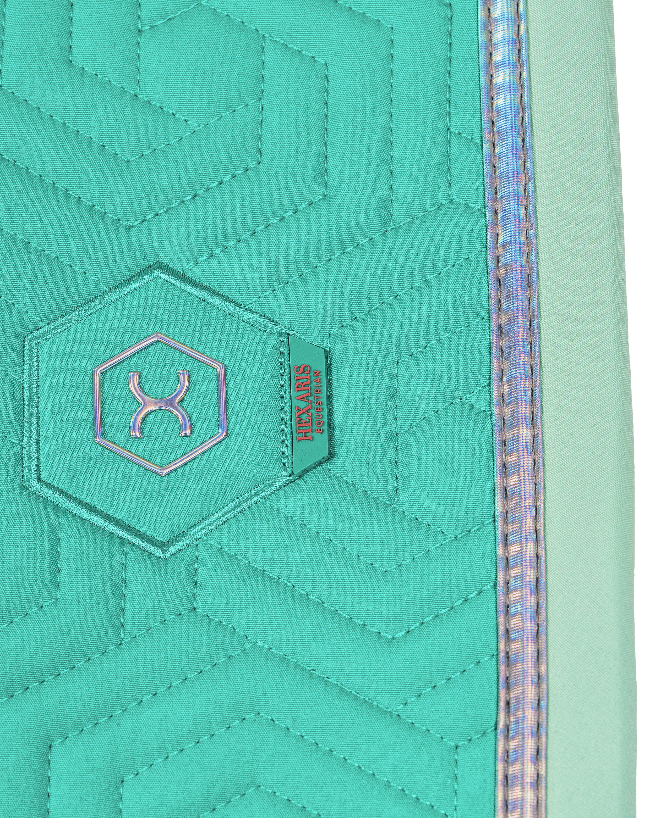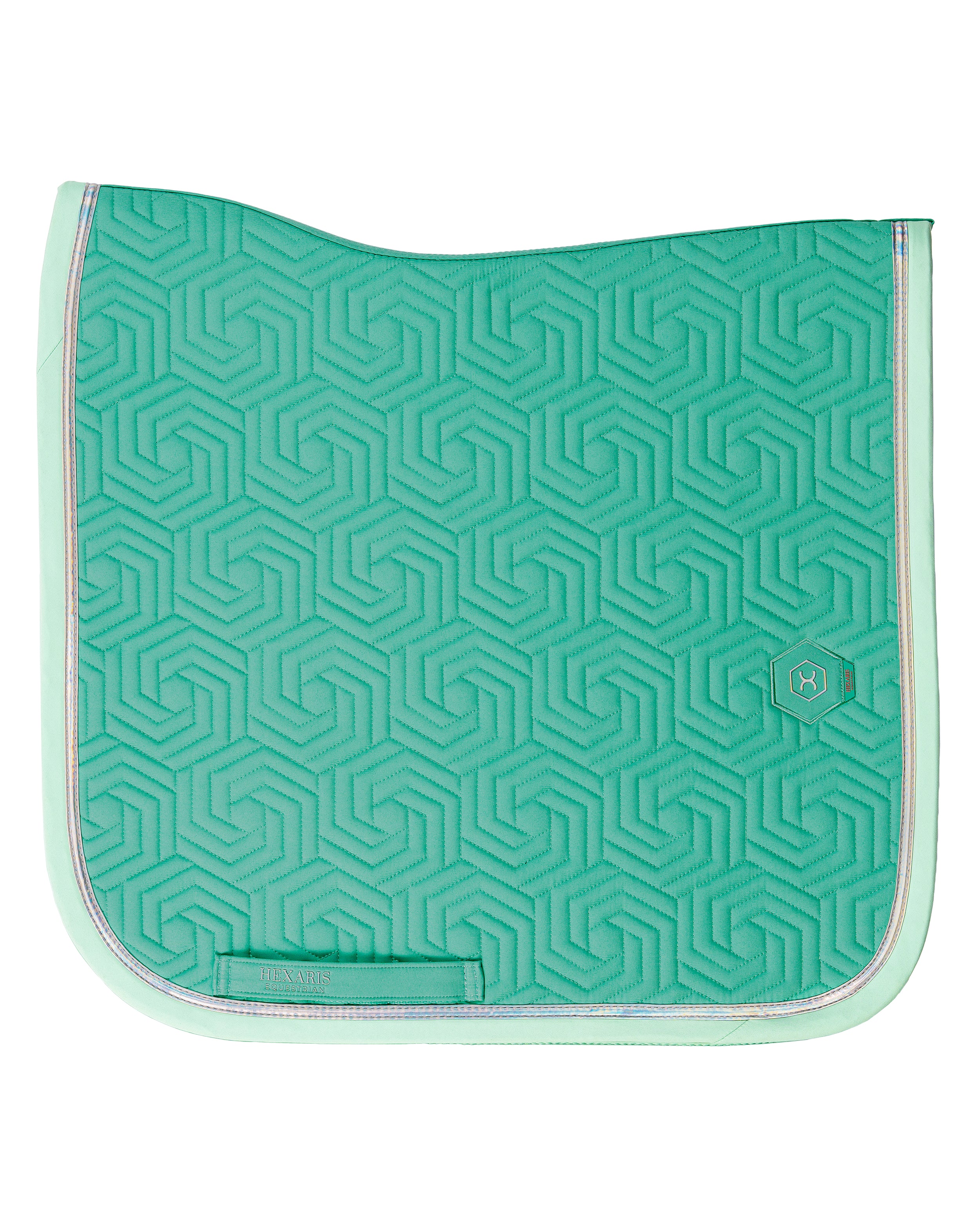 The Paradiso Dressage Saddle Pad in Sea Turquoise combines elegant style with a bold, modern finish. Featuring our signature hexagon quilting, this turquoise dressage saddle pad is complemented by mint-colored binding and finished with stunning matte holographic tape that adds a subtle touch of shine, evoking the vibrant hues of the Caribbean Sea.