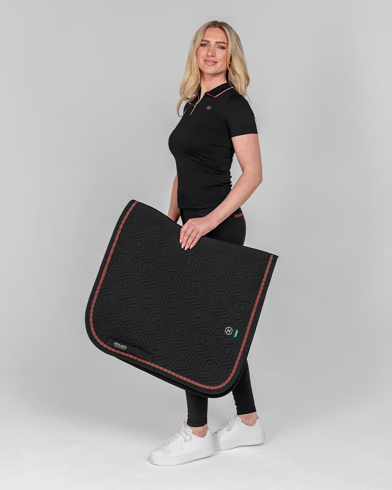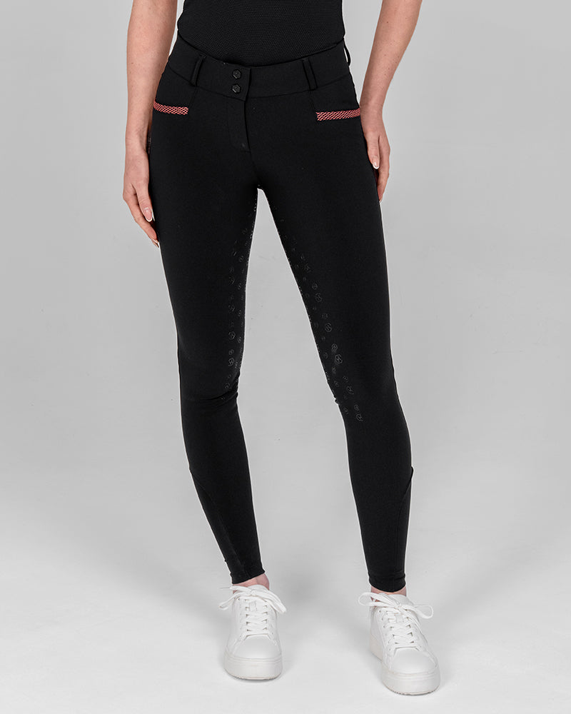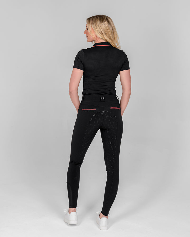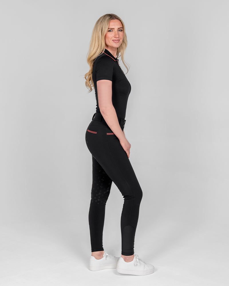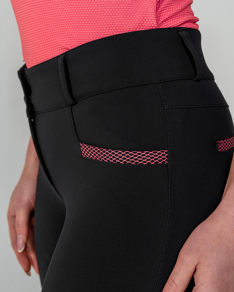 The Reef Compression Breeches in Toucan Black are mid-waisted women’s riding breeches designed for a flattering, supportive fit. Made from high-quality four-way stretch fabric with compression feel through the legs and a soft, comfortable waistband. Coral mesh pocket details add a sporty touch, while the full-seat silicone grip provides extra security when riding.