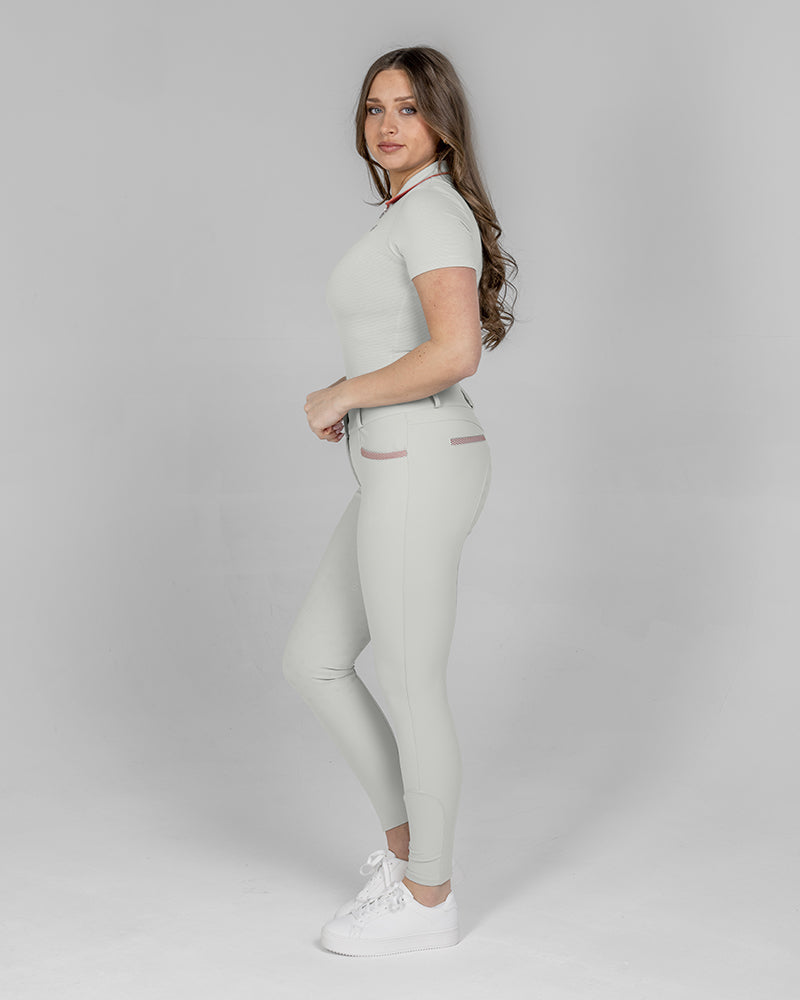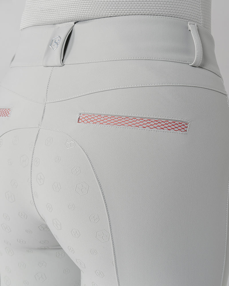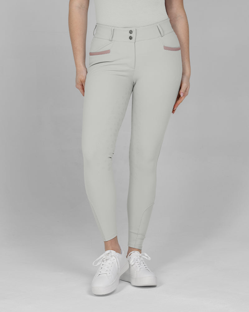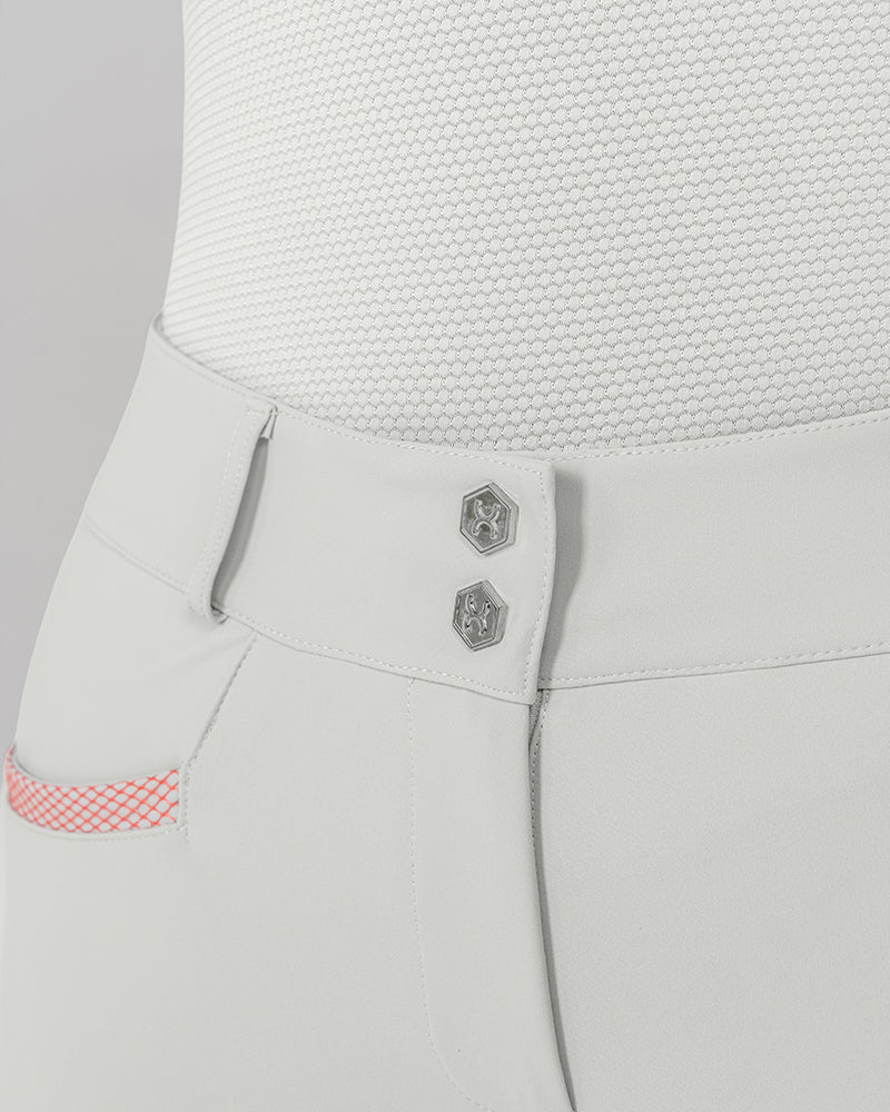 The Reef Compression Breeches in Shell Grey are mid-waisted women’s riding breeches designed for a flattering, supportive fit. Made from high-quality four-way stretch fabric with compression feel through the legs and a soft, comfortable waistband. Coral mesh pocket details add a sporty touch, while the full-seat silicone grip provides extra security when riding.
