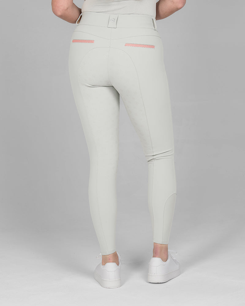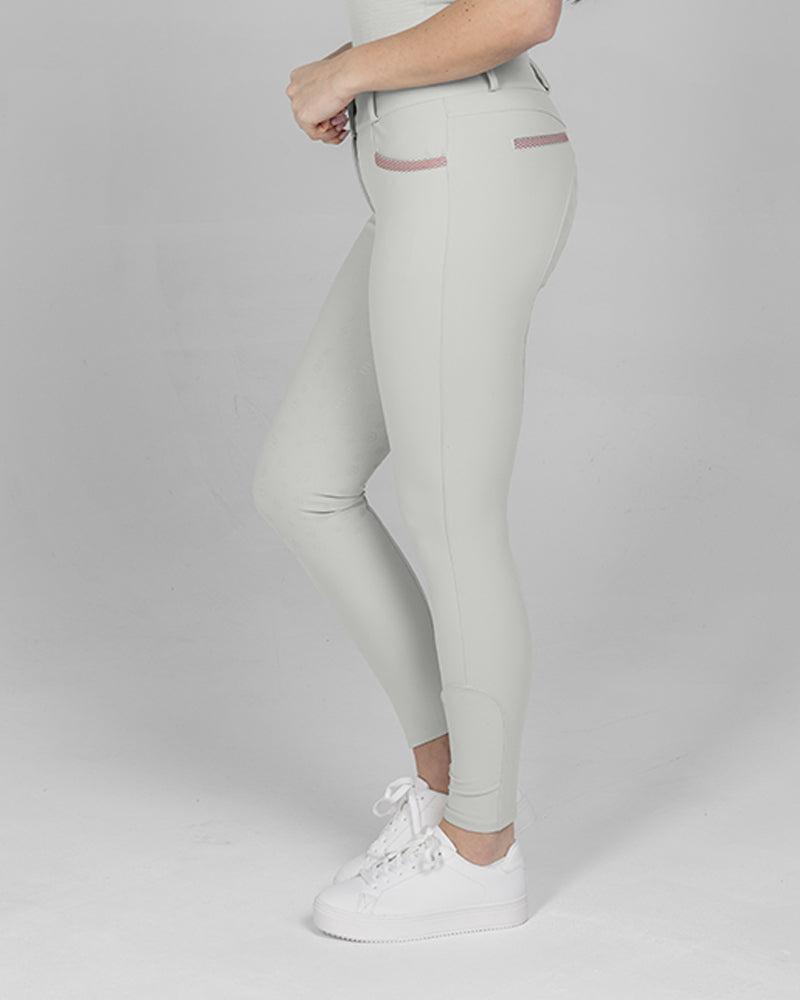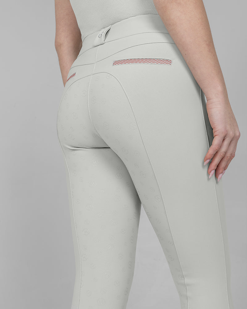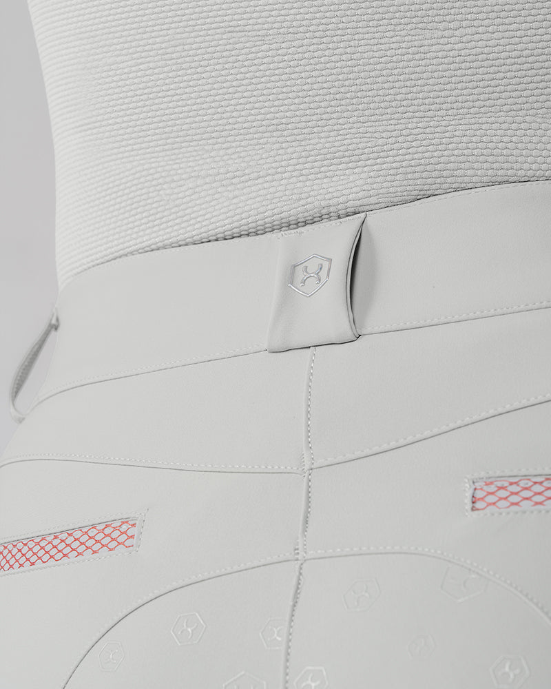 The Reef Compression Breeches in Shell Grey are mid-waisted women’s riding breeches designed for a flattering, supportive fit. Made from high-quality four-way stretch fabric with compression feel through the legs and a soft, comfortable waistband. Coral mesh pocket details add a sporty touch, while the full-seat silicone grip provides extra security when riding.