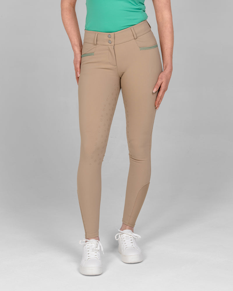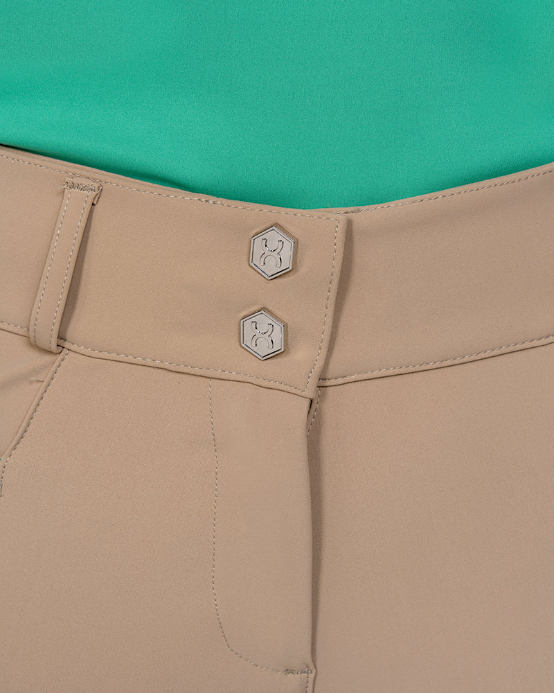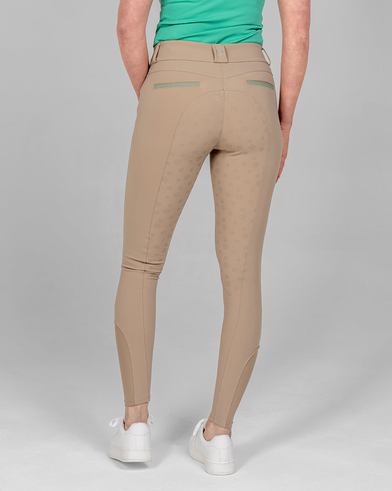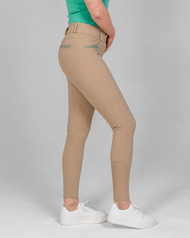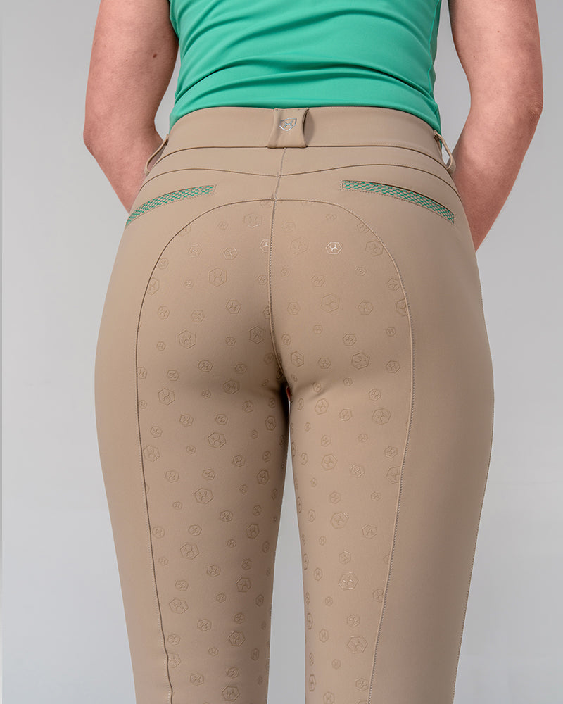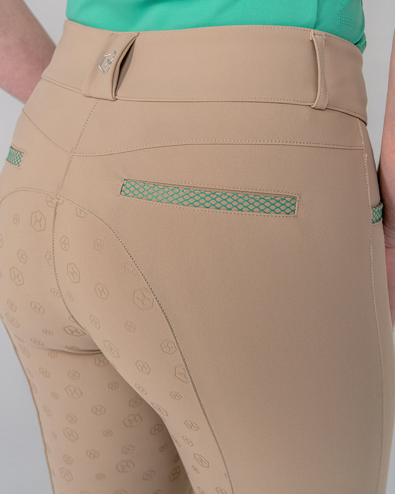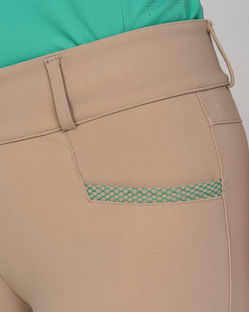 The Reef Compression Breeches in Sand Beige are mid-waisted women’s riding breeches designed for a flattering, supportive fit. Made from high-quality four-way stretch fabric with compression feel through the legs and a soft, comfortable waistband. Coral mesh pocket details add a sporty touch, while the full-seat silicone grip provides extra security when riding.