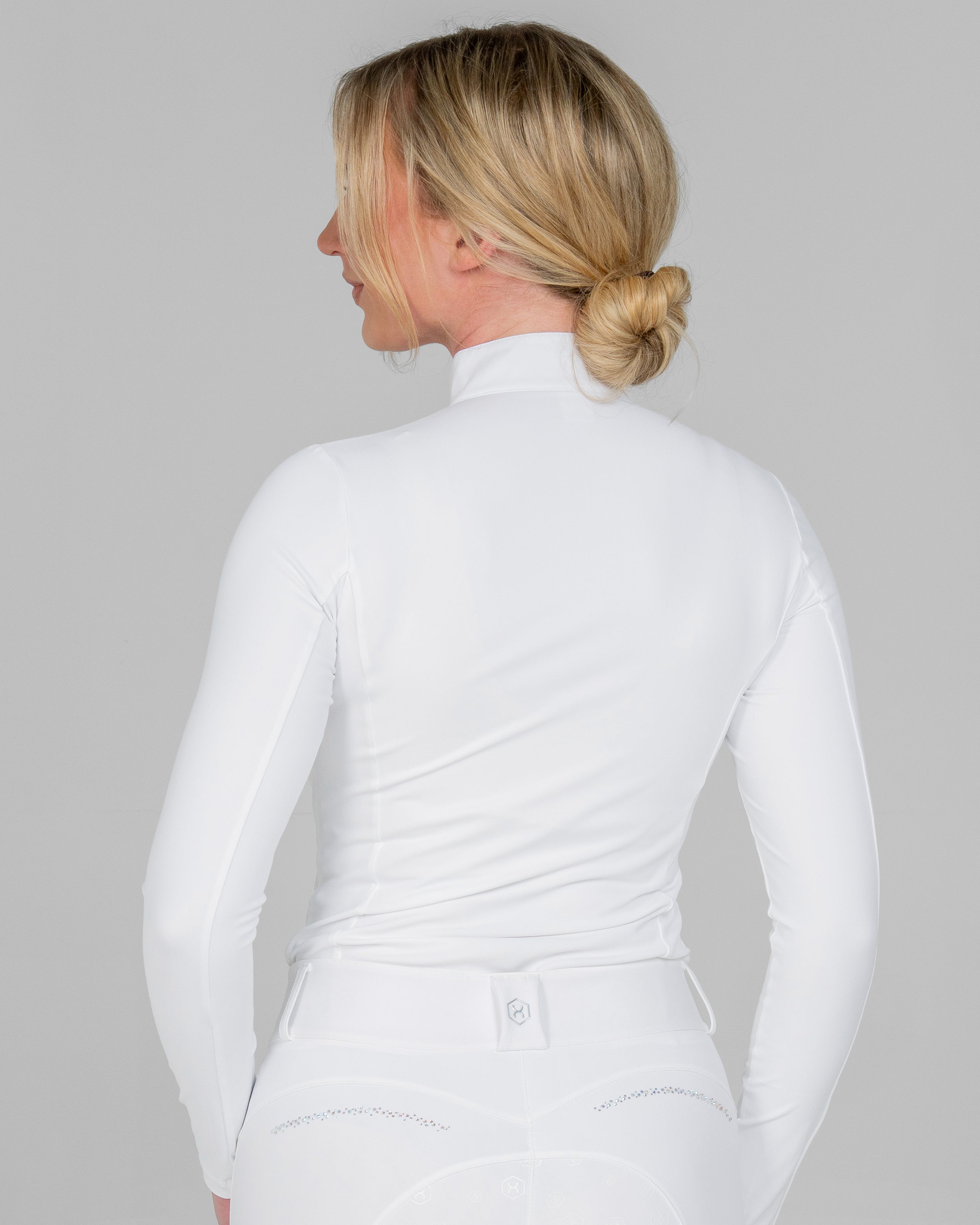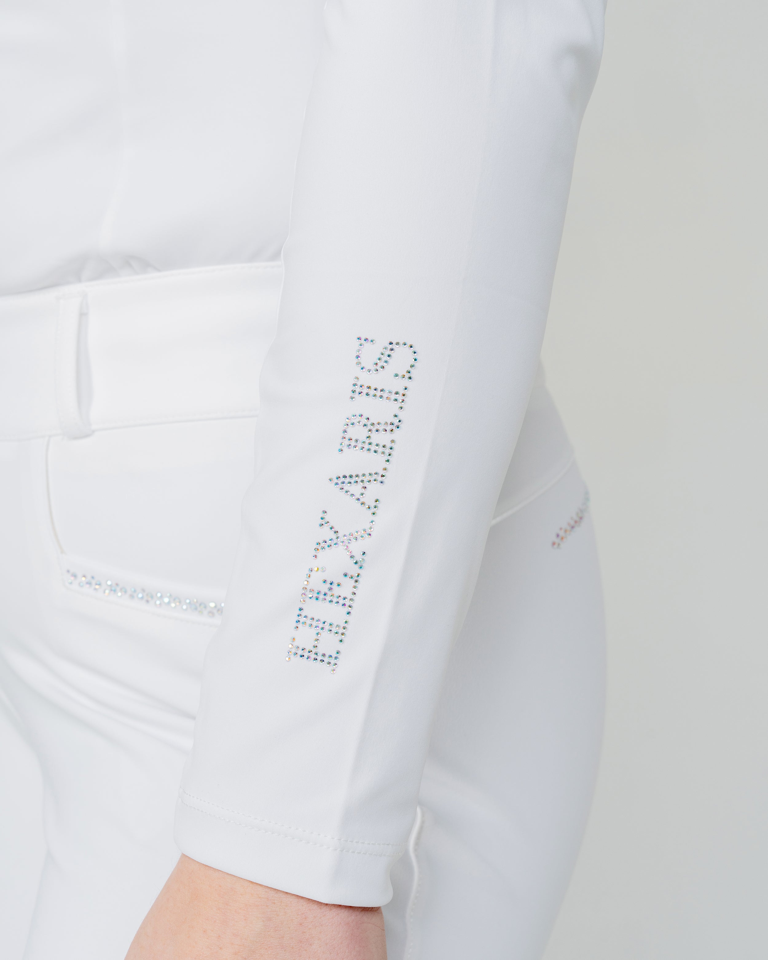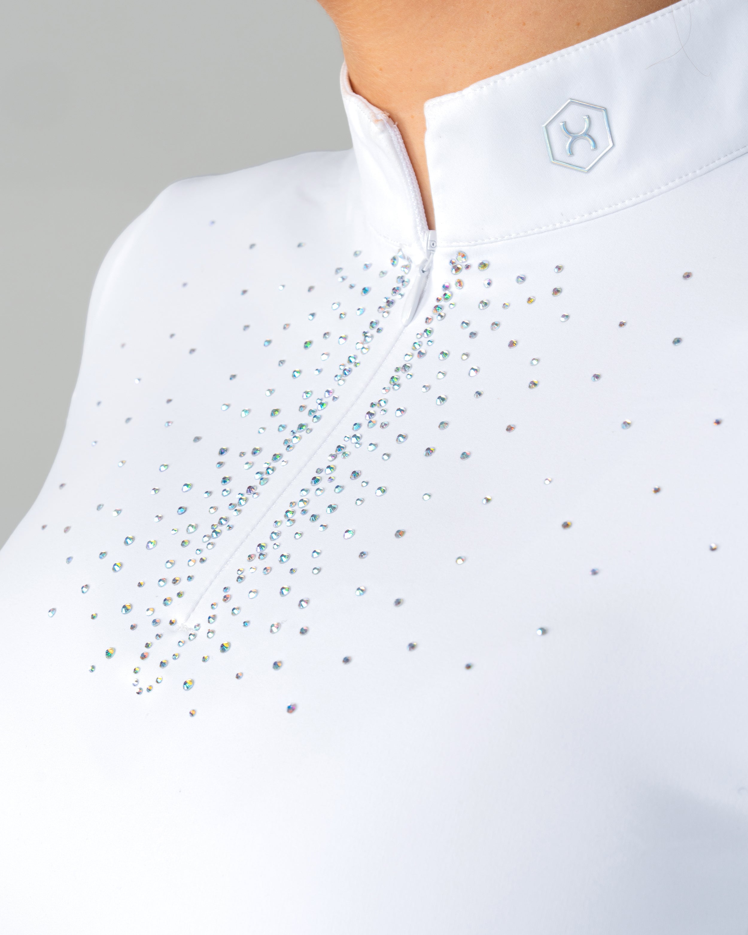 The White Aurora Long Sleeve Competition Shirt combines elegant performance with modern sparkle. Crafted from soft, stretchy performance fabric, this white show shirt offers a sleek, flattering fit. Delicate Aurora Borealis rhinestones on the chest and sleeve add a refined touch of shine, making it a standout piece in any rider’s wardrobe.