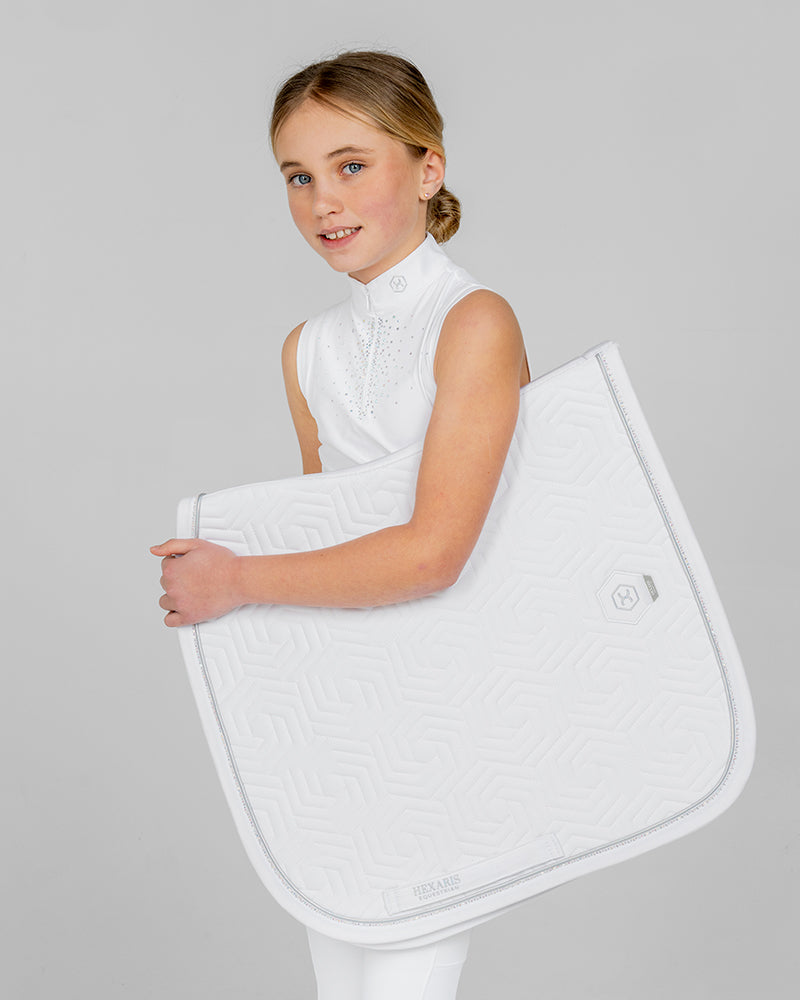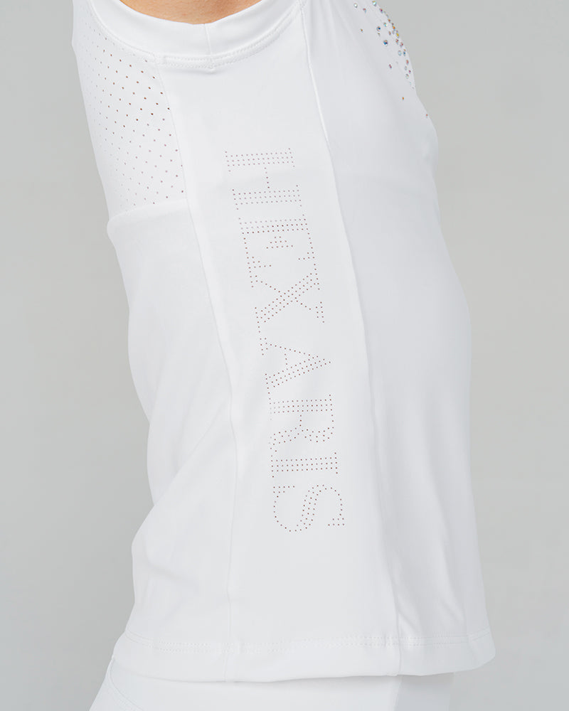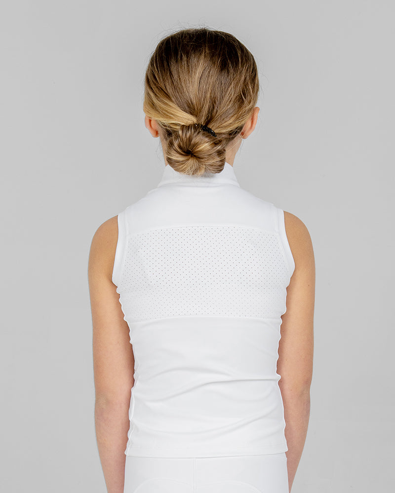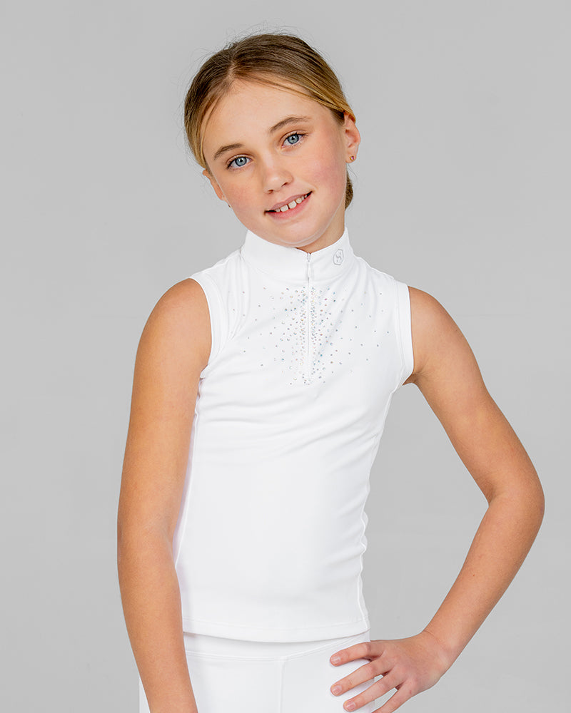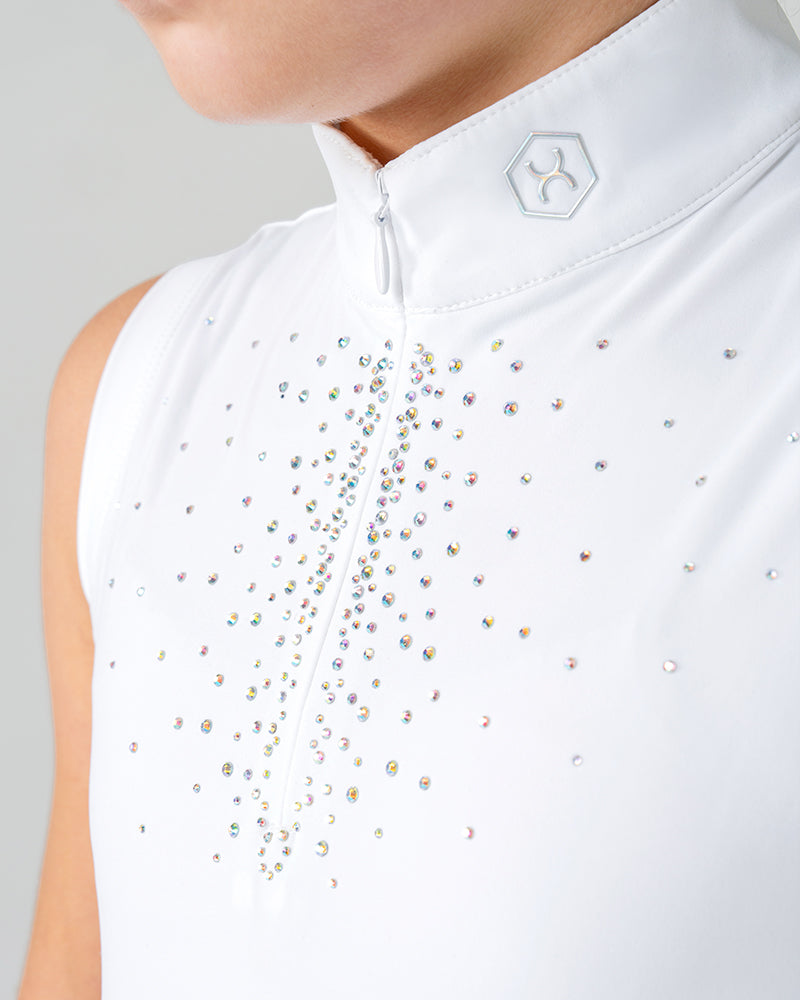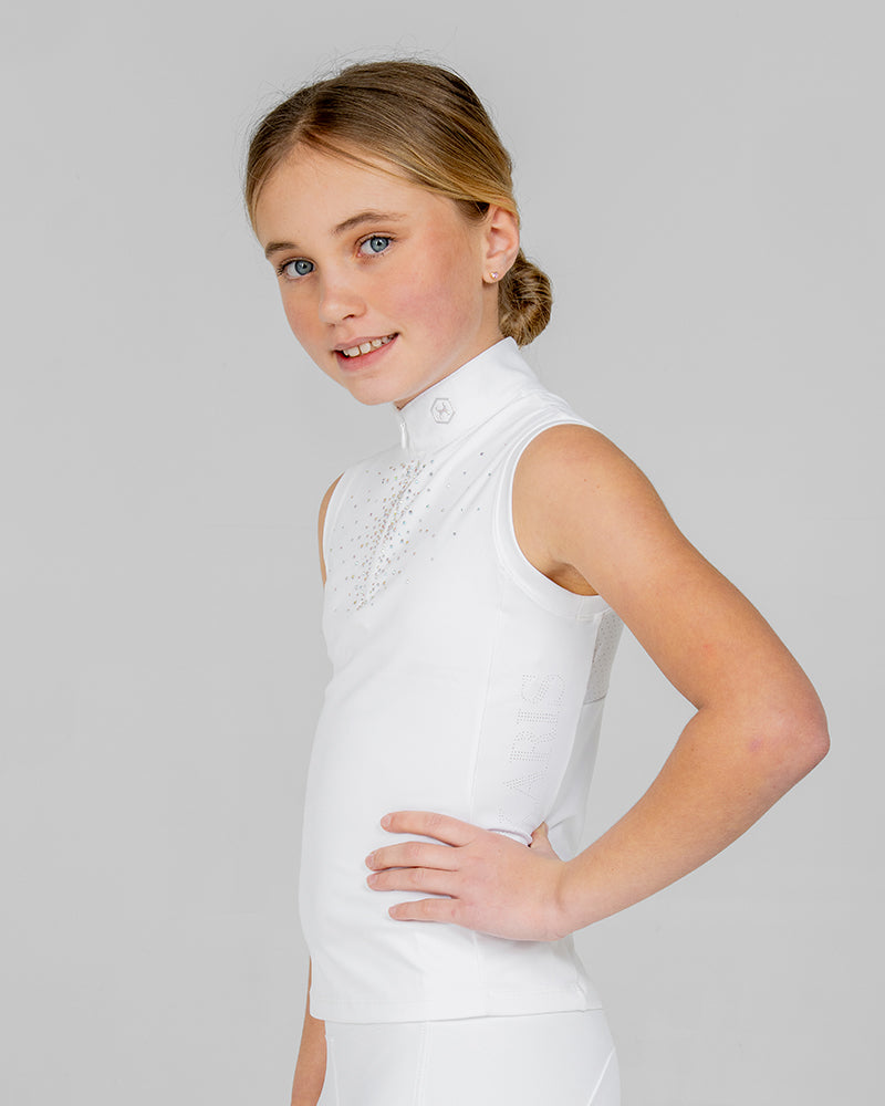 The White Aurora Kids Sleeveless Competition Shirt combines elegant performance with modern sparkle. Crafted from soft, stretchy performance fabric with laser-cut panels for improved airflow, this breathable children’s white show shirt offers a sleek, flattering silhouette. Delicate Aurora Borealis rhinestones on the chest add a refined touch of shine, making it a standout piece in any young rider’s competition wardrobe.