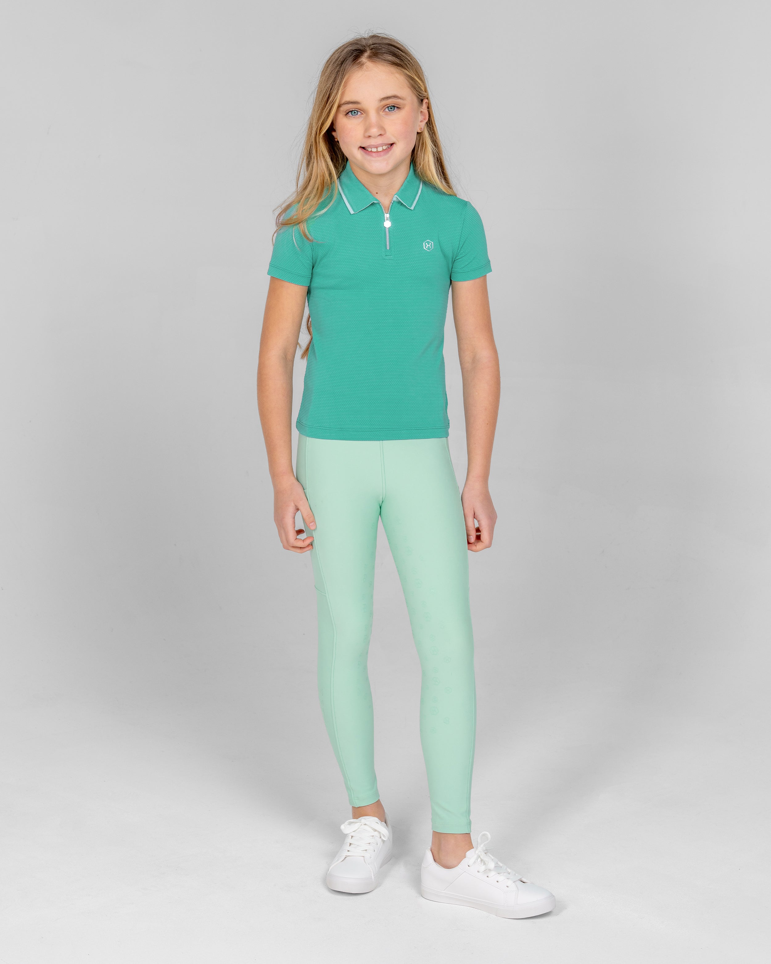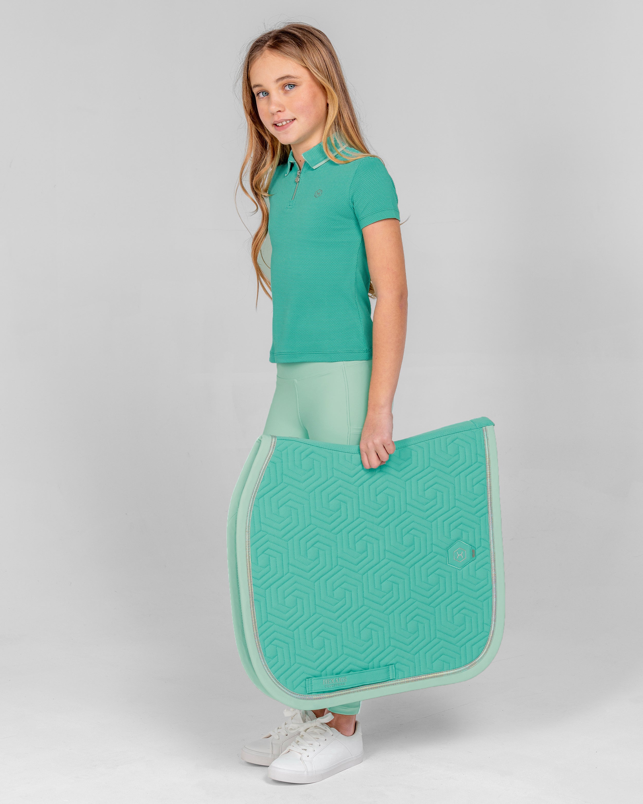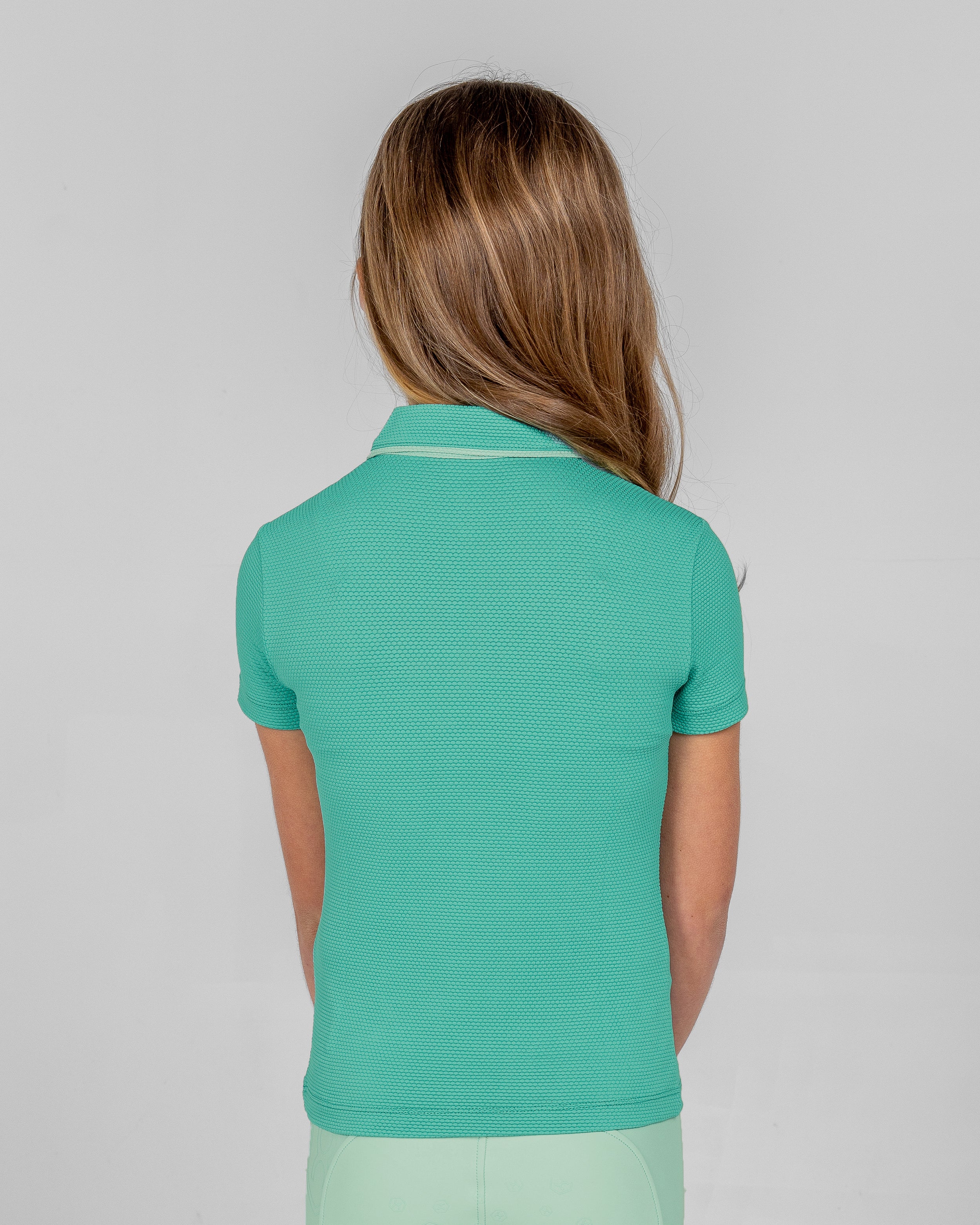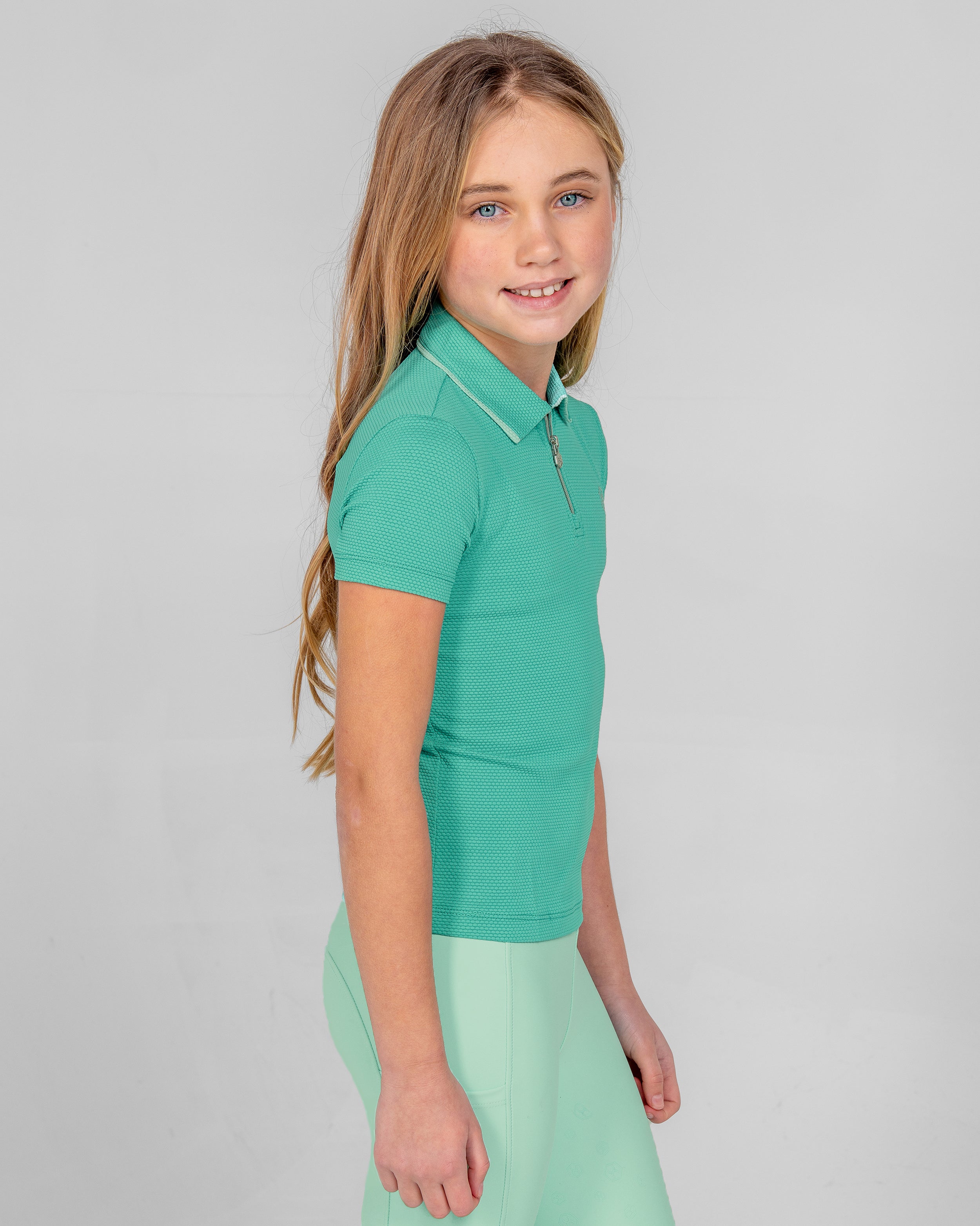 The Calypso Kids Short Sleeve Polo in Sea Turquoise blends classic polo style with a modern sporty look. Made from soft, stretchy fabric with a subtle hexagon pattern, this kids riding polo shirt offers a very comfortable slim fit for training sessions and active days.