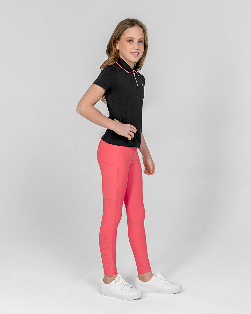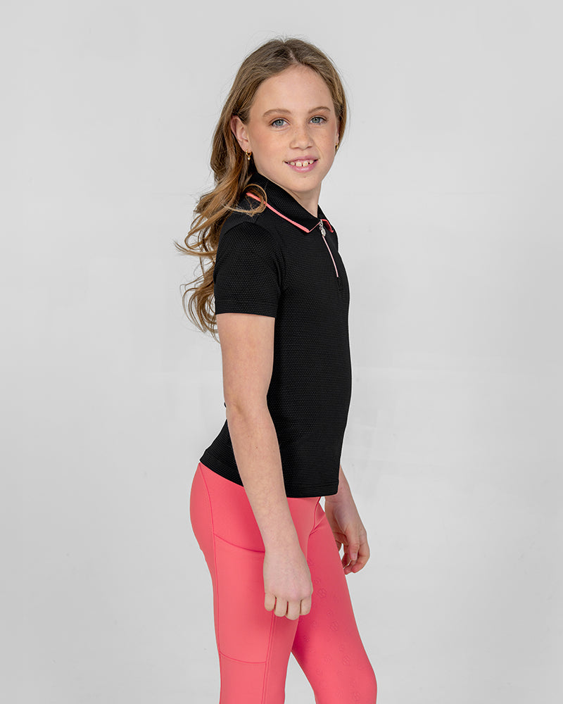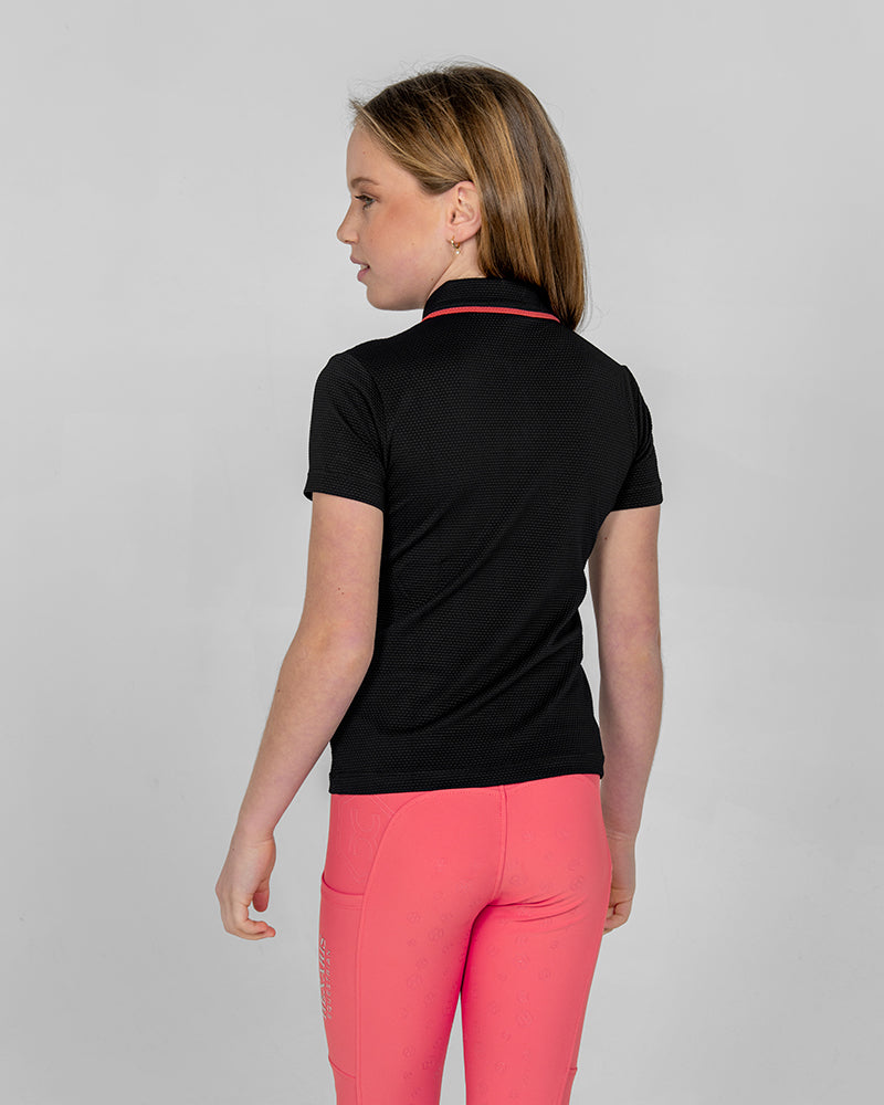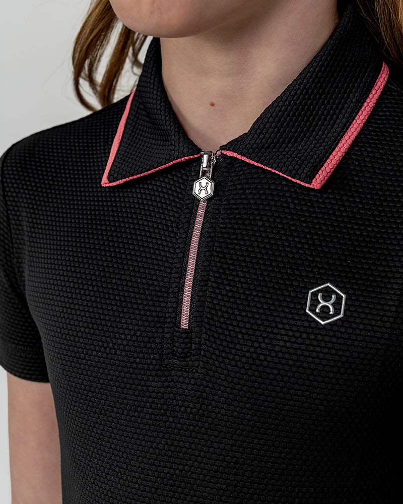 The Calypso Kids Short Sleeve Polo in Toucan Black blends classic polo style with a modern sporty look. Made from soft, stretchy fabric with a subtle hexagon pattern, this kids riding polo shirt offers a comfortable slim fit and breathable performance for training sessions and active days.