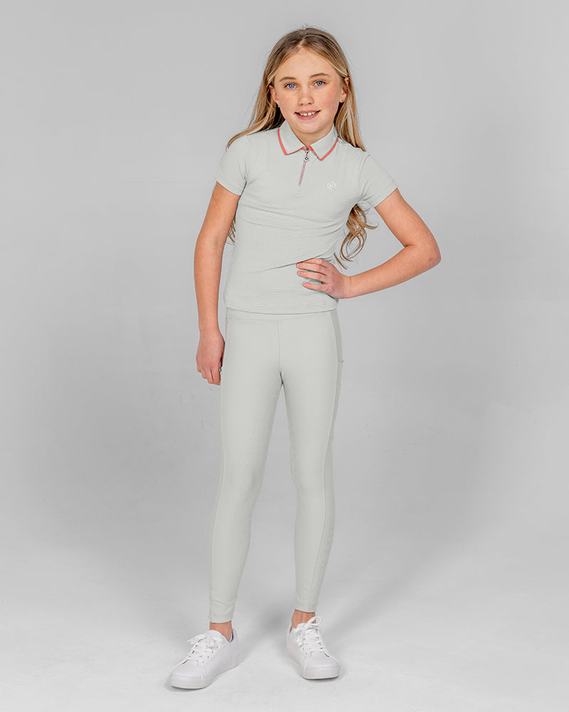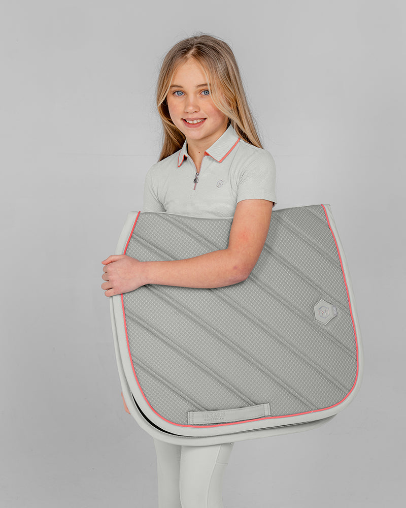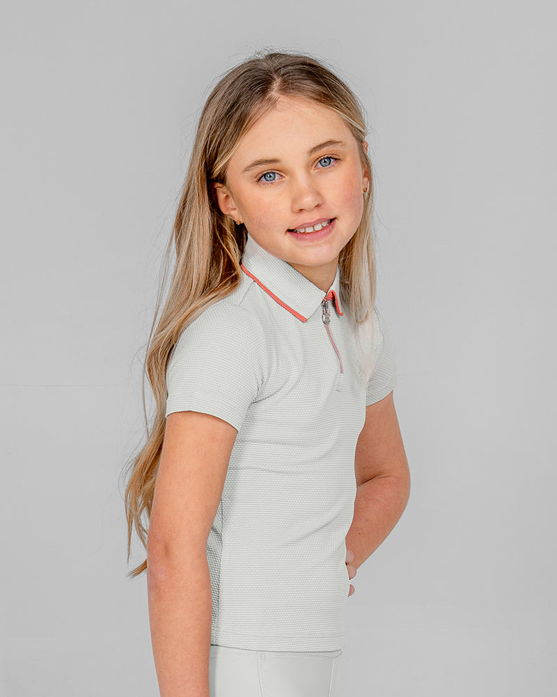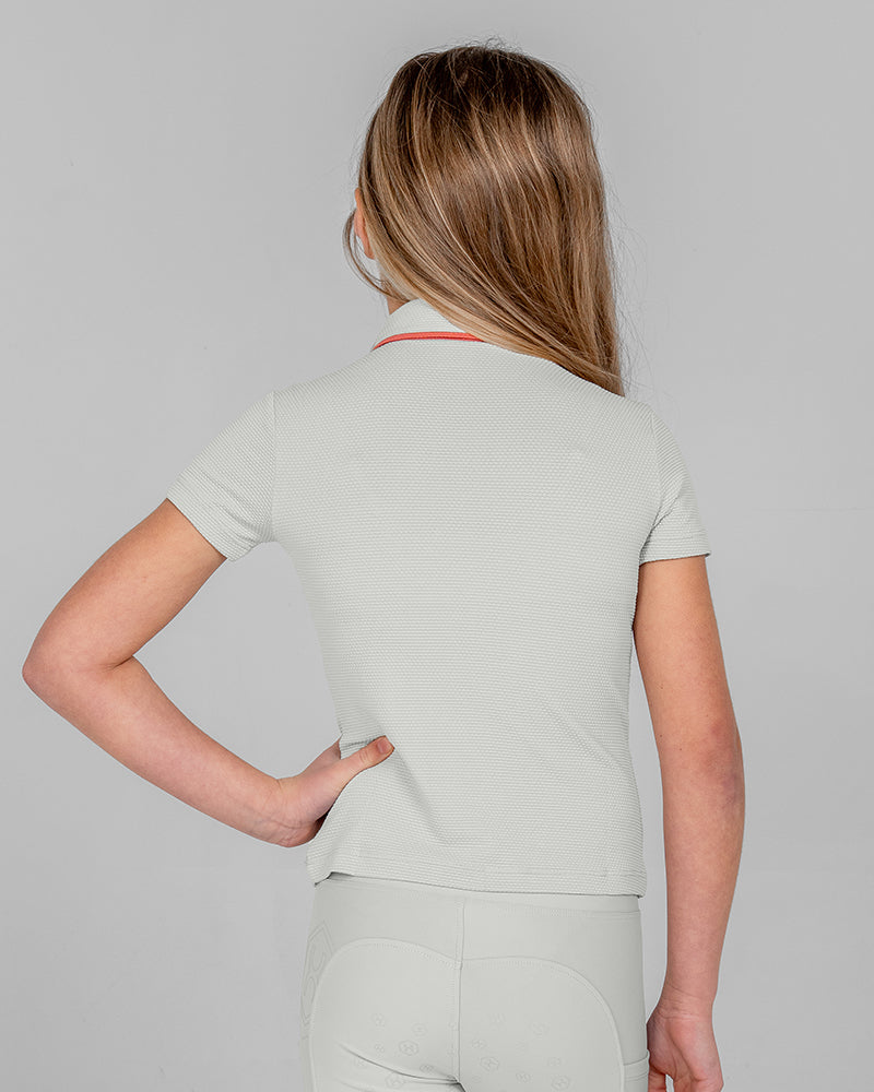 The Calypso Kids Short Sleeve Polo in Shell Grey blends classic polo style with a modern sporty look. Made from soft, stretchy fabric with a subtle hexagon pattern, this kids riding polo shirt offers a very comfortable slim fit for training sessions and active days.