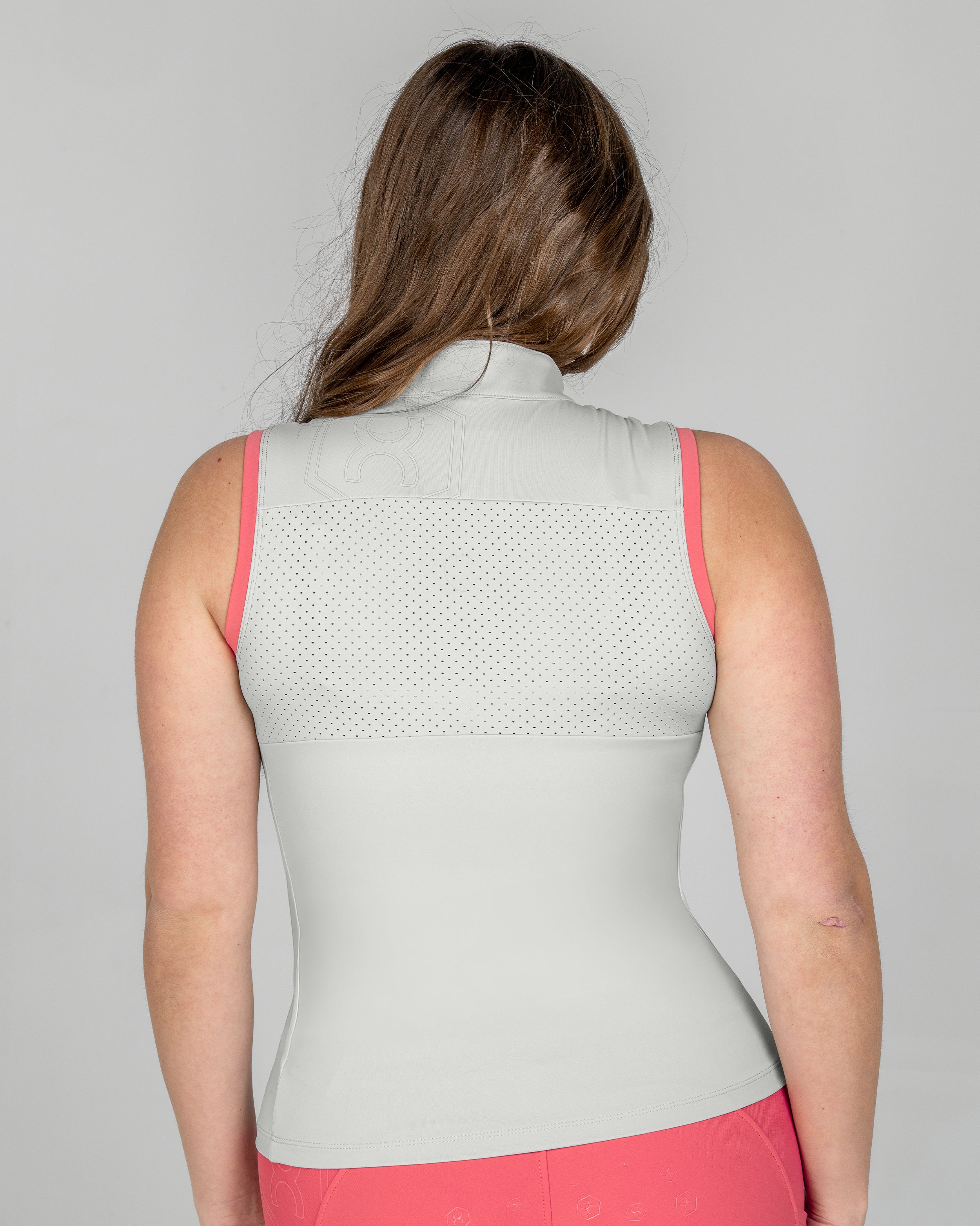 The Tide Sleeveless Training Top in Shell Grey is the perfect choice for hot summer days. Featuring contrast color at the armholes and collar, it offers a flattering fit thanks to its soft, stretchy fabric. Laser-perforated side and back panels help keep riders cool and comfortable throughout the day.