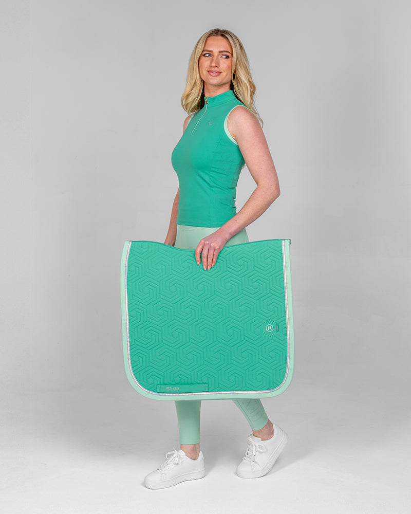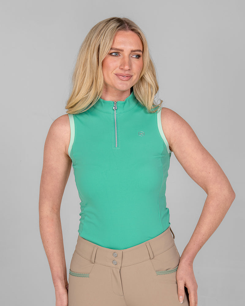 The Tide Sleeveless Training Top in Sea Turquoise is the perfect choice for hot summer days. Featuring contrast color at the armholes and collar, it offers a flattering fit thanks to its soft, stretchy fabric. Laser-perforated side and back panels help keep riders cool and comfortable throughout the day.