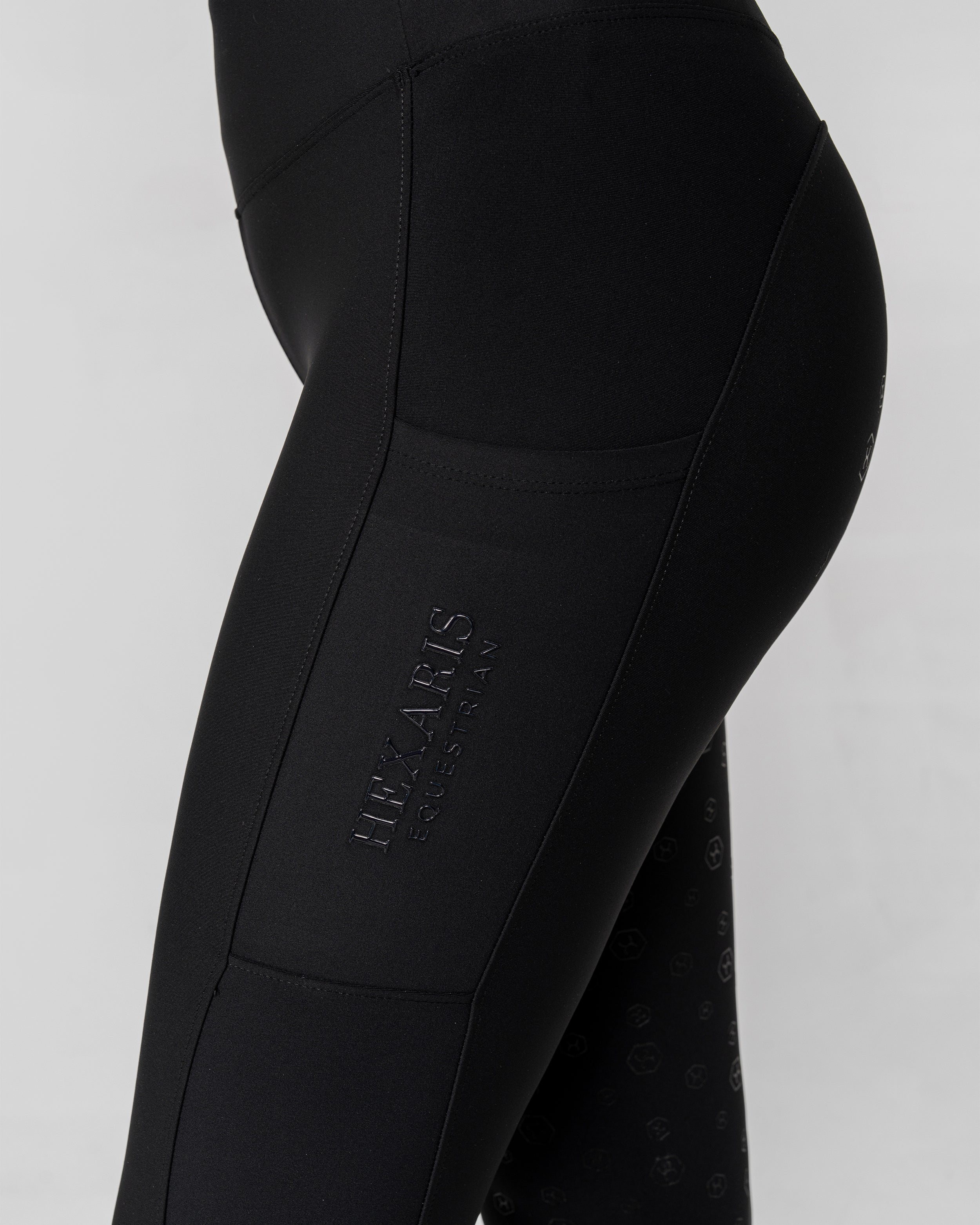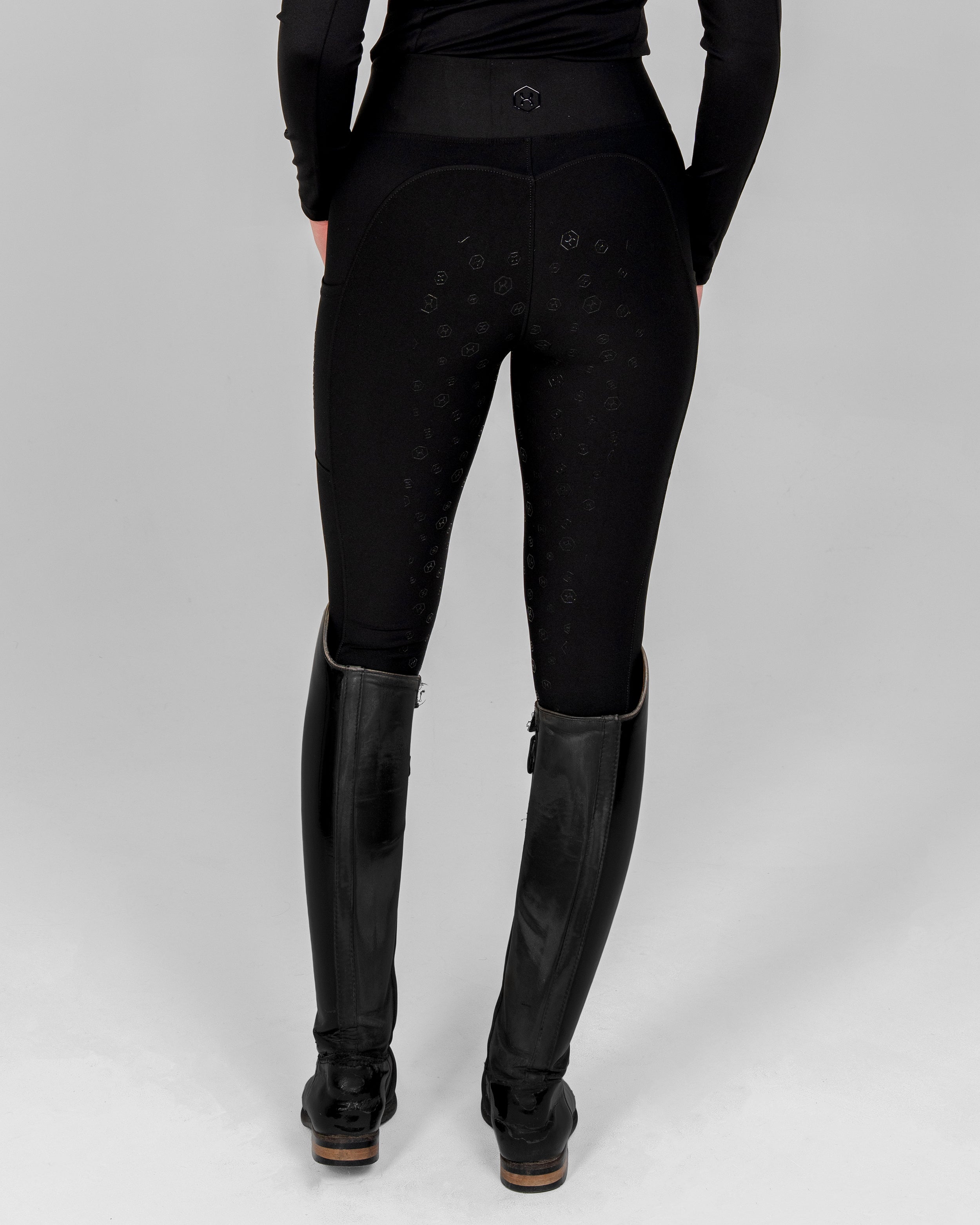 The Black Opal riding leggings are designed for riders who prioritize comfort and performance. The stretchy fabric feels like a second skin and provides supportive compression, while the reinforced elastic waistband prevents sagging and ensures a secure fit. They feature branding on the pocket and waistband with an iridescent finish the reveals blue, red and green tones in the sunlight - inspired by the natural color play of opal stones.
