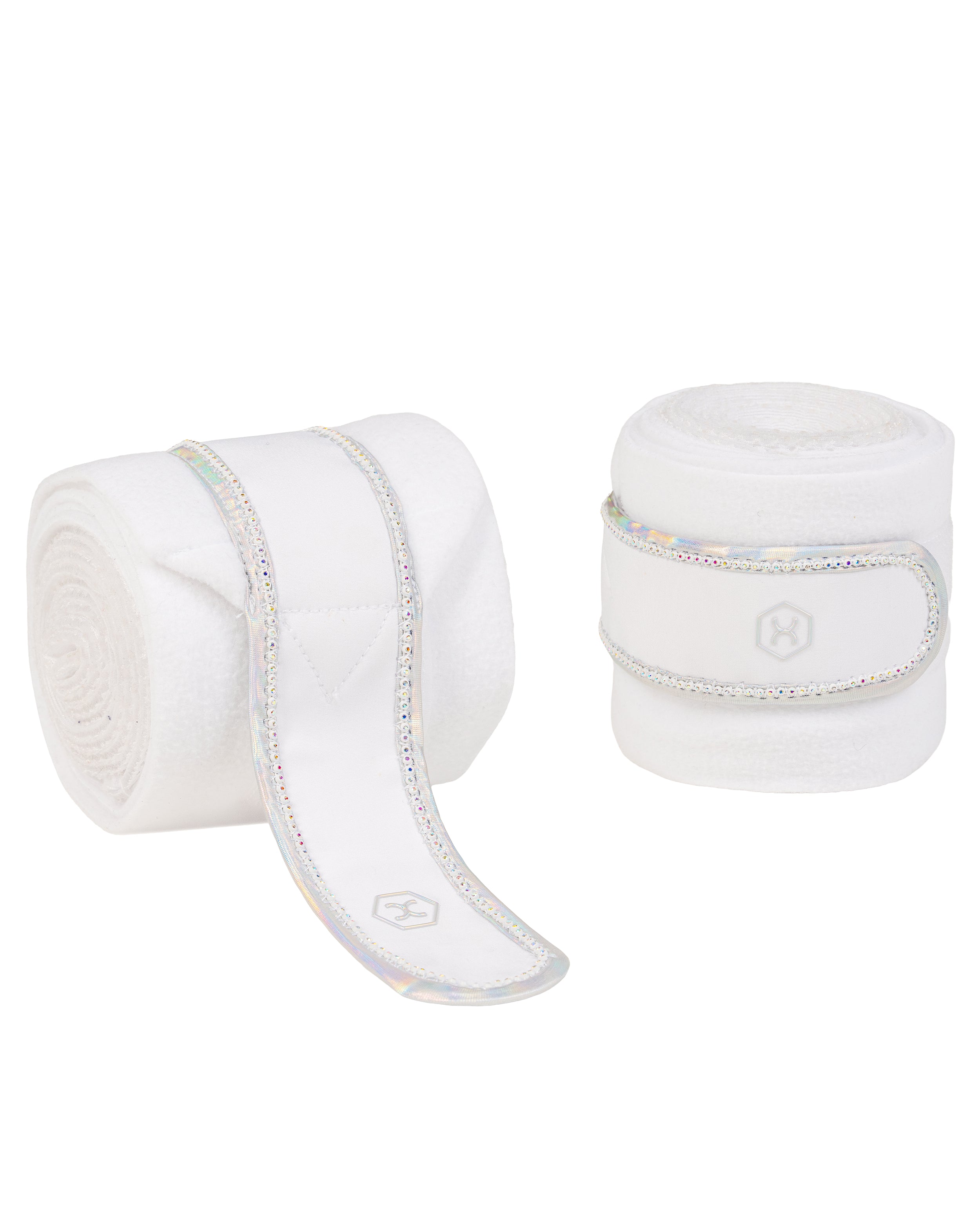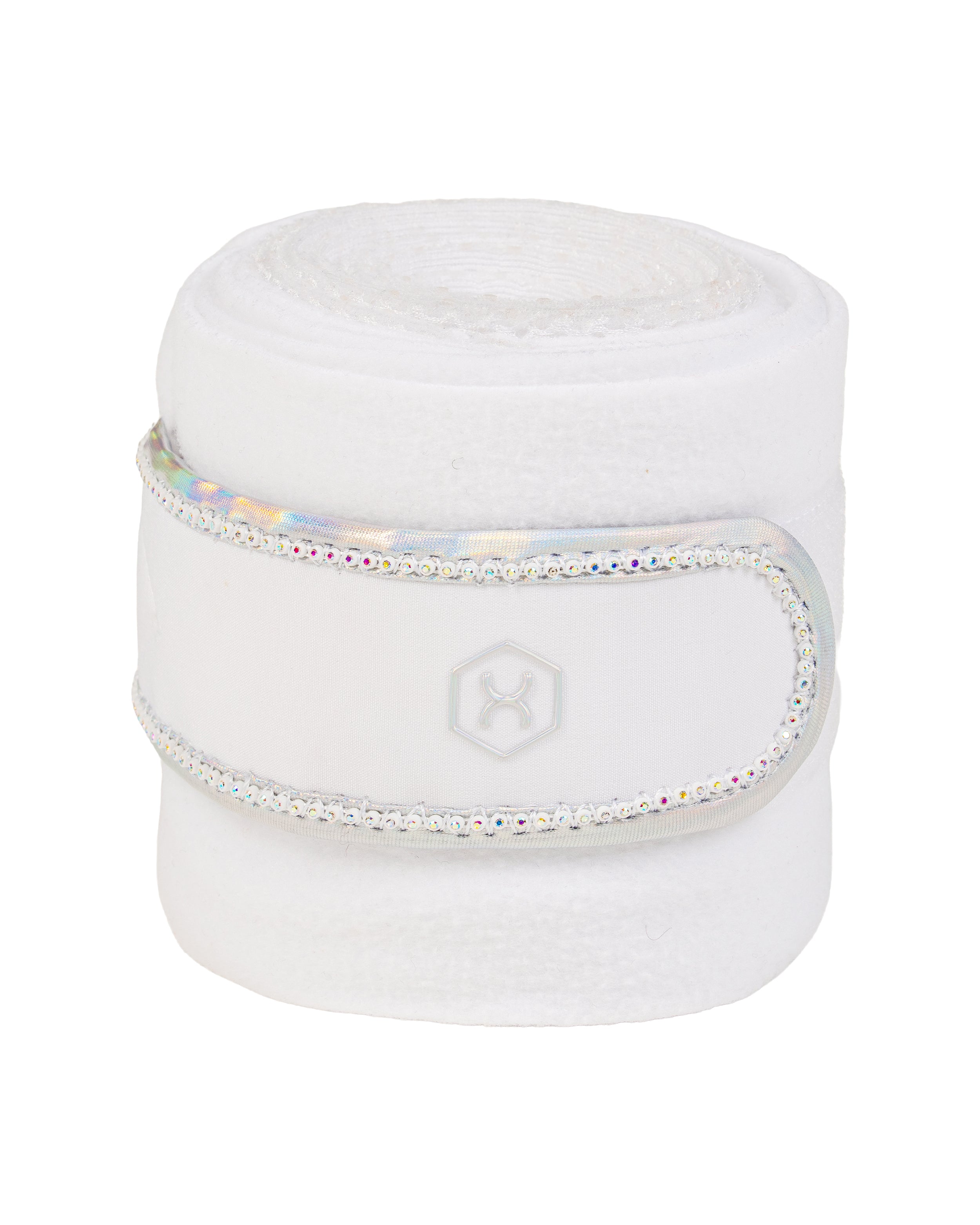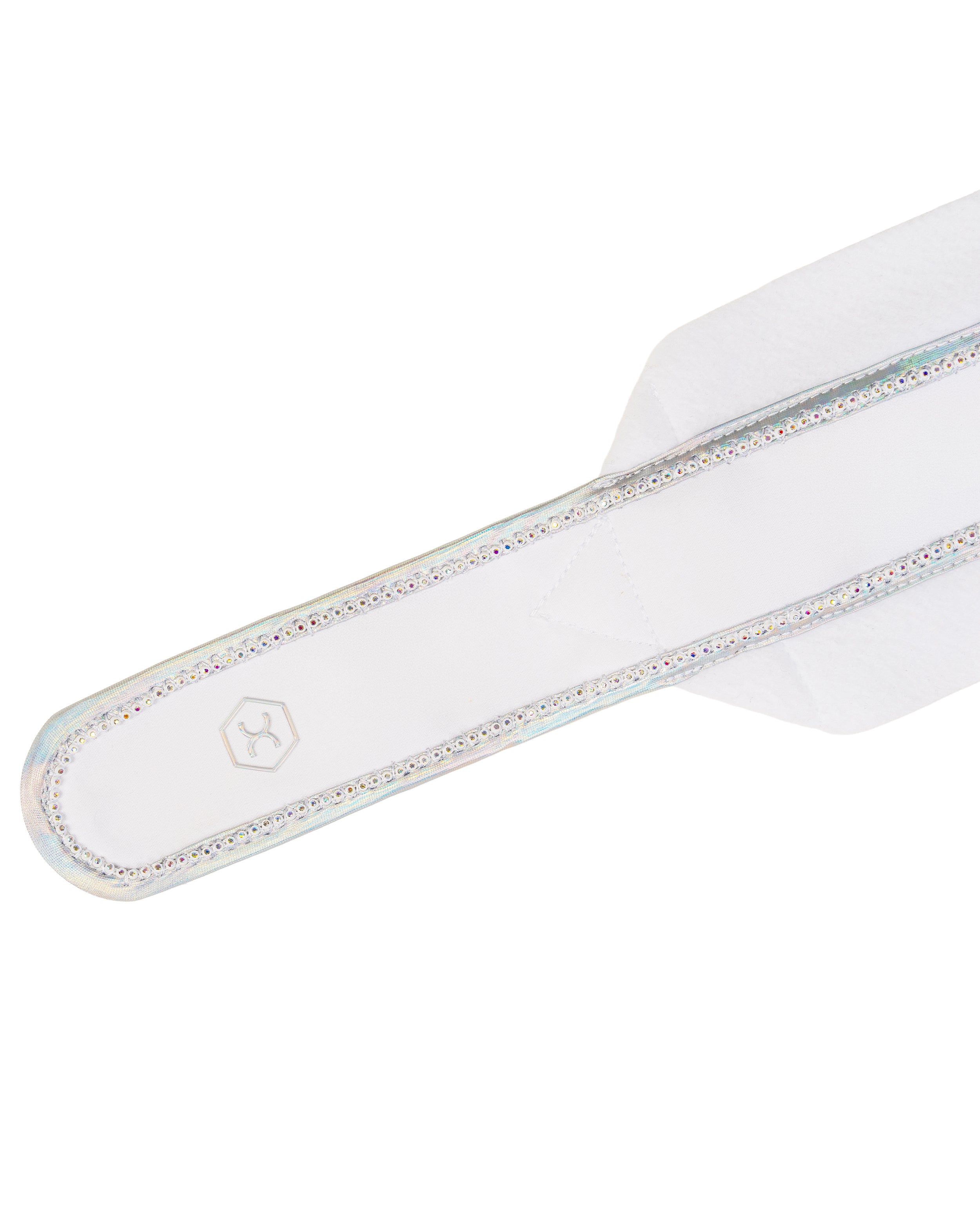 The White Aurora Competition Bandages, featuring holographic details and Aurora Borealis rhinestones, are exclusive horse leg wraps designed for riders who want the classic polo wrap look with a touch of sparkle and enhanced breathability. The first section of the bandage is made from breathable 3D mesh and is wrapped directly around the horse’s leg to improve airflow. The second section is soft polo fleece, wrapped over the mesh to create a traditional outer finish.