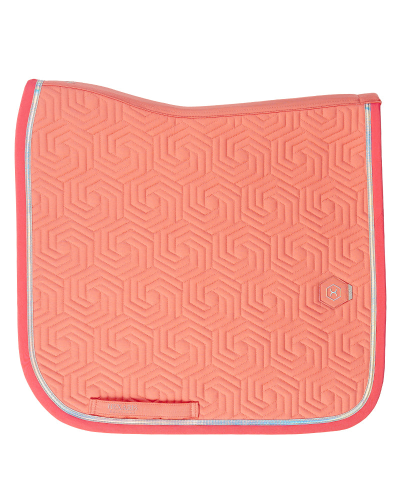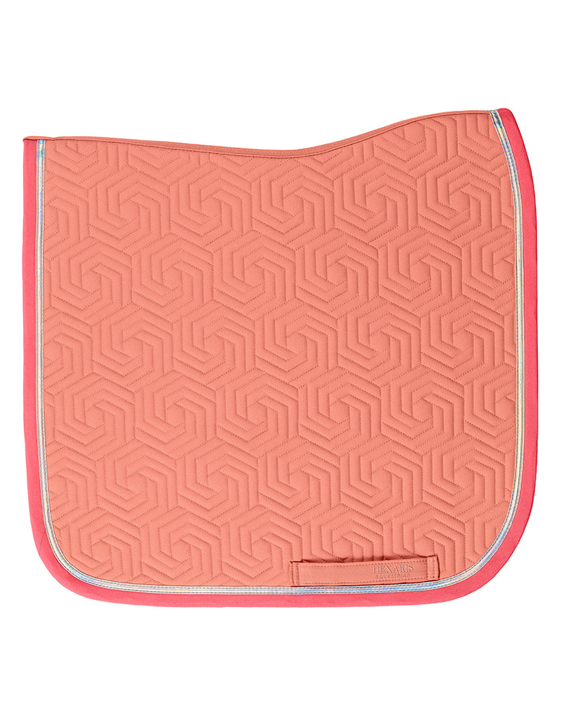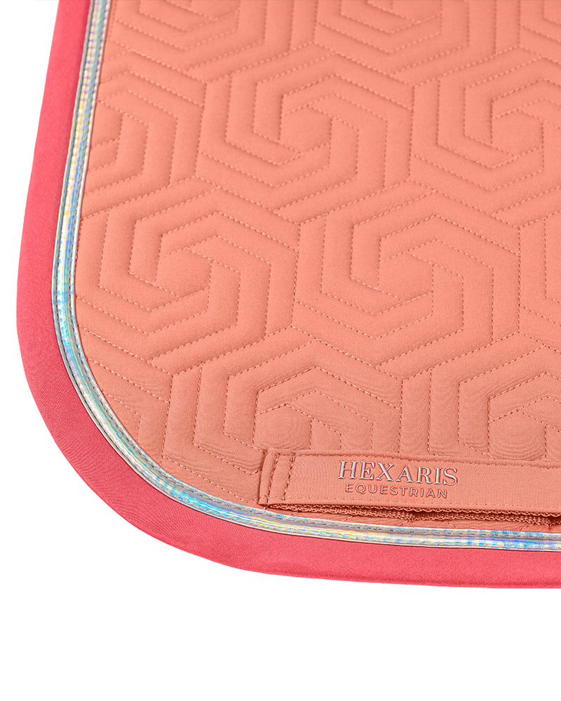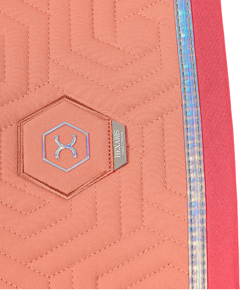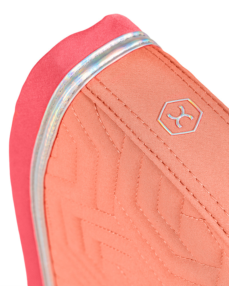 The Paradiso Dressage Saddle Pad in Flamingo Peachcombines elegant style with a bold, modern finish. Featuring our signature hexagon quilting, this peach dressage saddle pad is complemented by coral-colored binding and finished with stunning matte holographic tape that adds a subtle touch of shine, evoking the warm glow of a beach sunset.