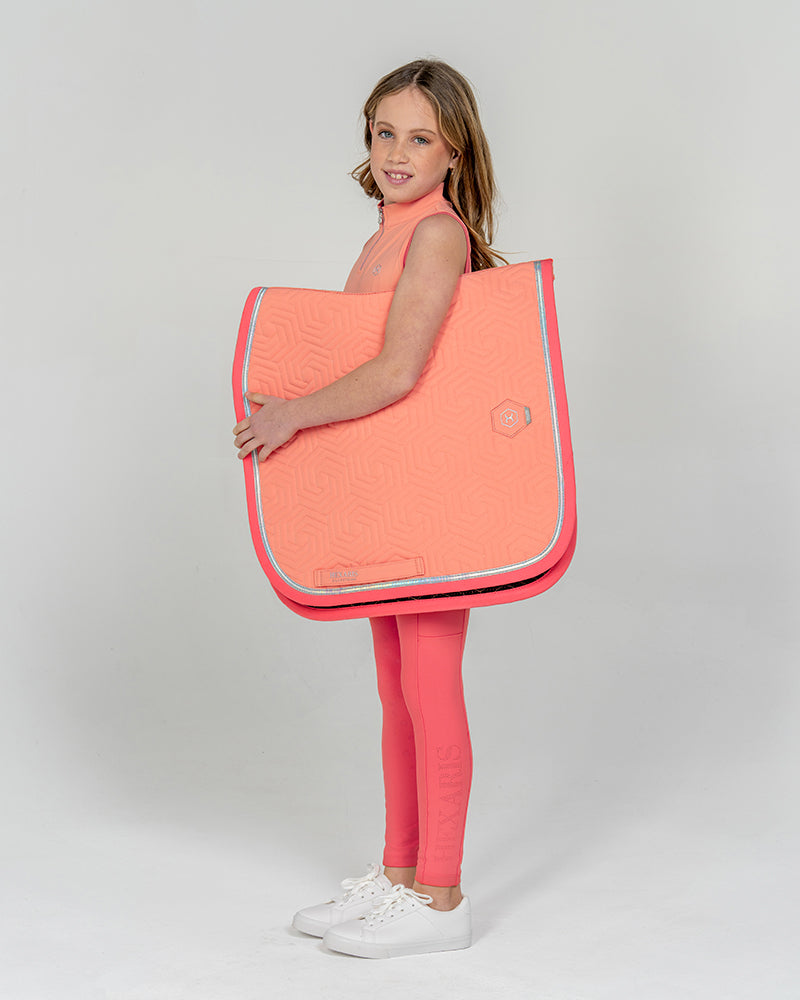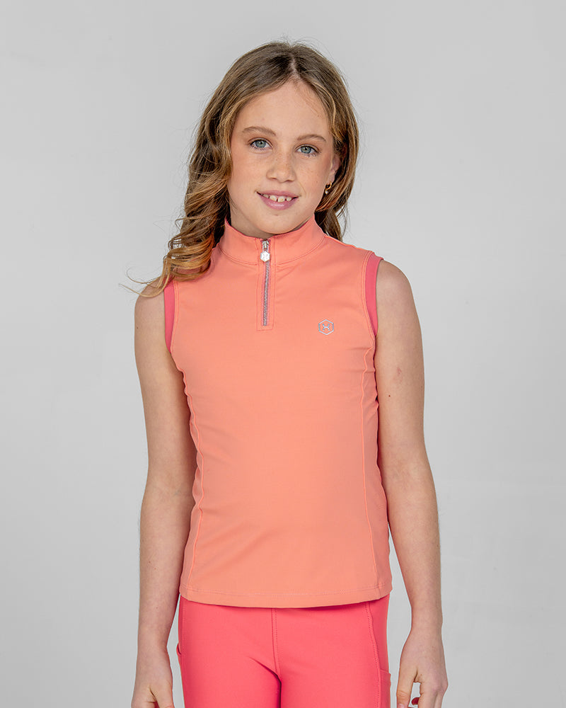The Tide Kids Sleeveless Training Top in Flamingo Peach is the perfect choice for hot summer days. Featuring contrast color at the armholes and collar, it offers a flattering fit thanks to its soft, stretchy fabric. Laser-perforated side and back panels help keep young riders cool and comfortable throughout the day.