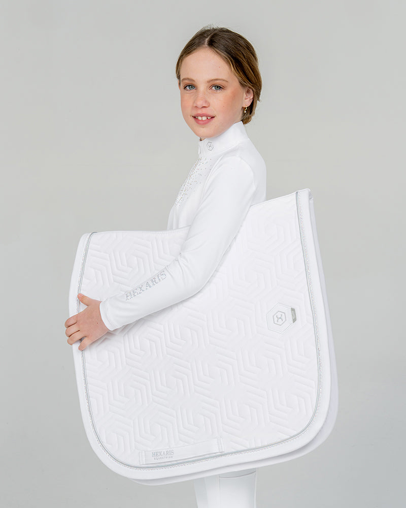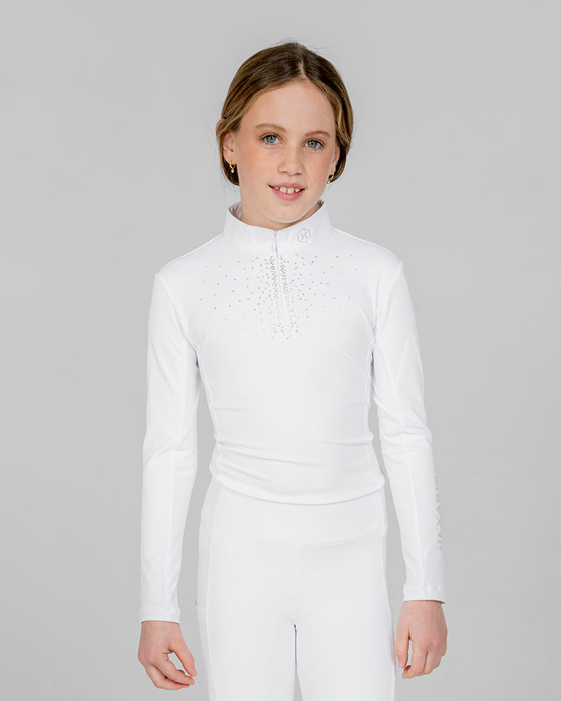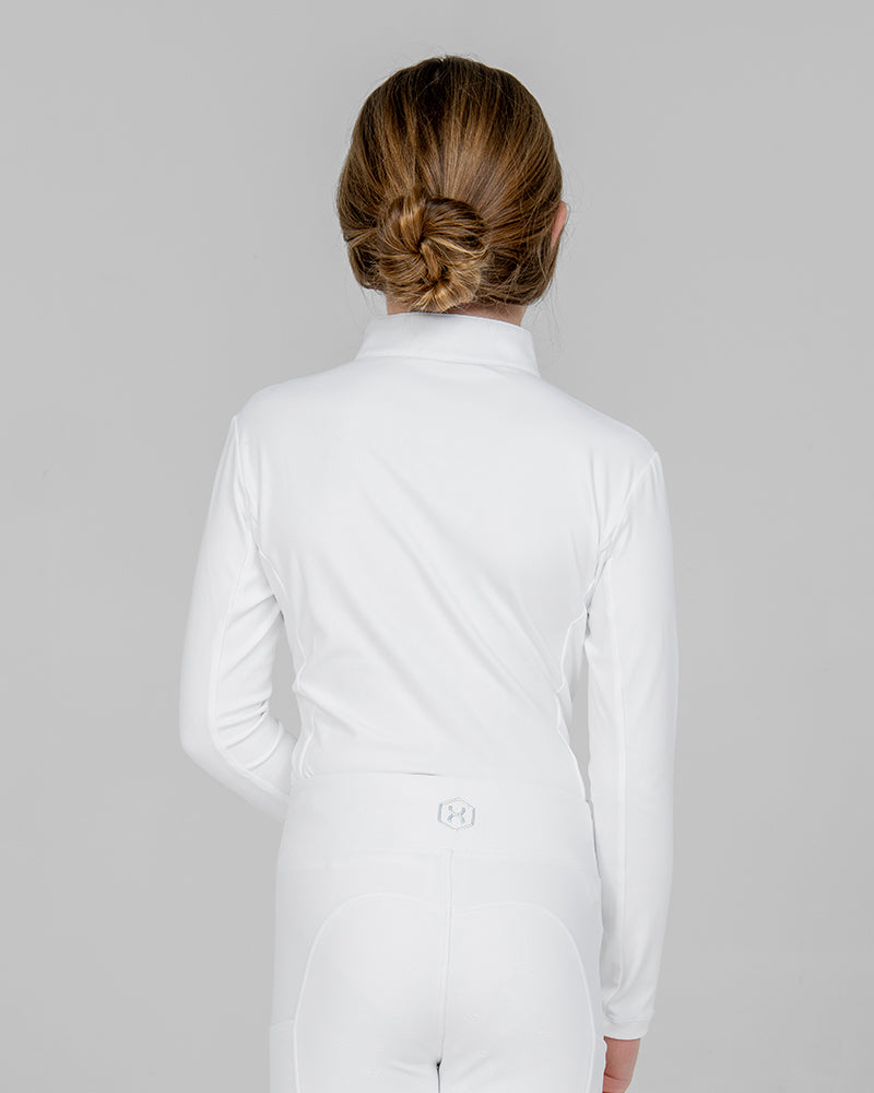 The White Aurora Kids Long Sleeve Competition Shirt combines elegant performance with modern sparkle. Crafted from soft, stretchy performance fabric, this children's white show shirt offers a sleek, flattering fit. Delicate Aurora Borealis rhinestones on the chest and sleeve add a refined touch of shine, making it a standout piece in any rider’s wardrobe.